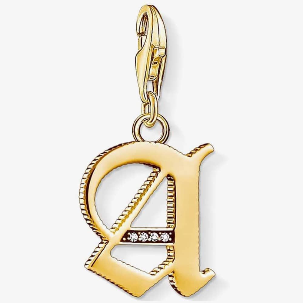 Create a unique style statement on your THOMAS SABO bracelet or necklace with this gorgeous gold plated letter A charm. The stylish charm impresses with a vintage font, glamorous stone set detailing and golden brilliance. A must have for an individual look.