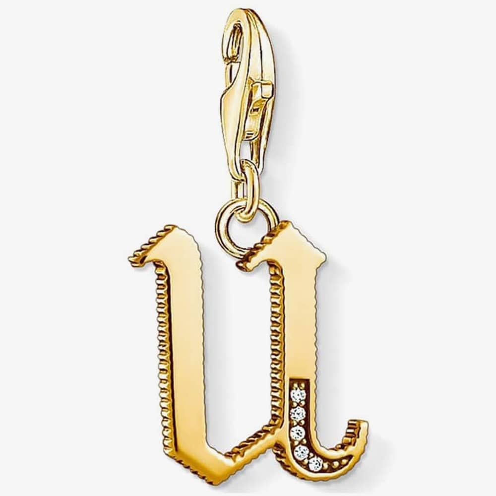 Create a unique style statement on your THOMAS SABO bracelet or necklace with this gorgeous gold plated letter U charm. The stylish charm impresses with a vintage font, glamorous stone set detailing and golden brilliance. A must have for an individual look.