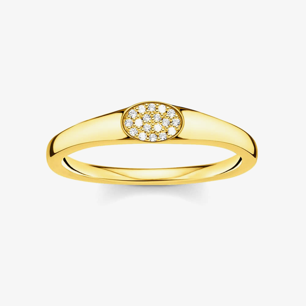 This attractive and eye catching ring is perfect for everyday wear. Created in sterling silver with a glistening gold plating, the ring features an oval shaped design that is encrusted with sparkling zirconia stones. Wear the ring individually or stack with other rings from the collection for an on-trend finish to your look.