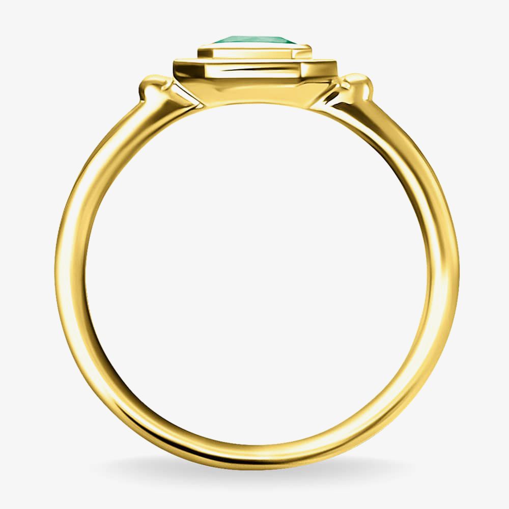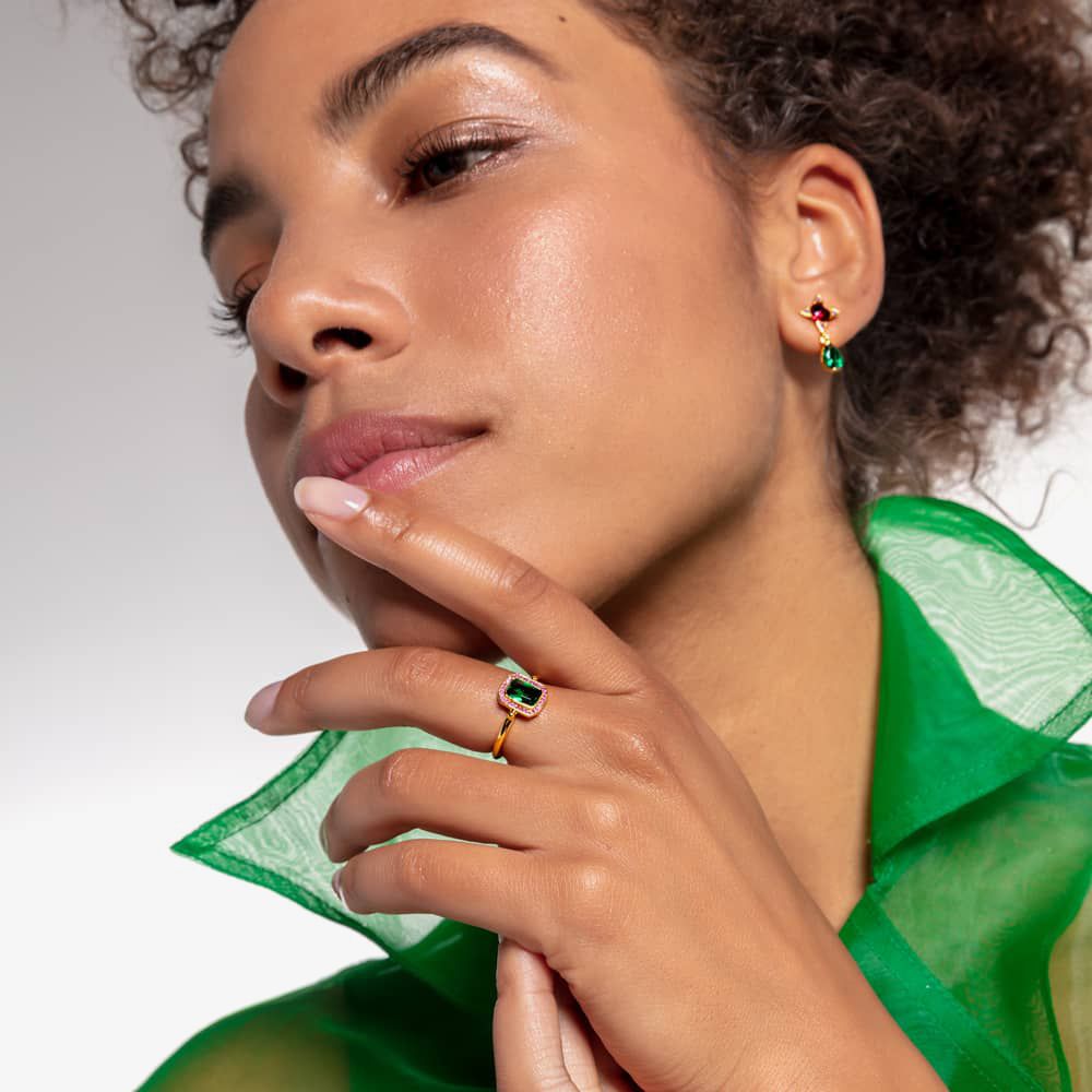 Crafted in an 18ct yellow gold plating, this stunning ring features an eye catching stone embellishment in complementary colours of green and red. The multi-faceted octagon stone has been skillfully hand crafted. Wear individually or stack with similar rings from the collection for a statement look.