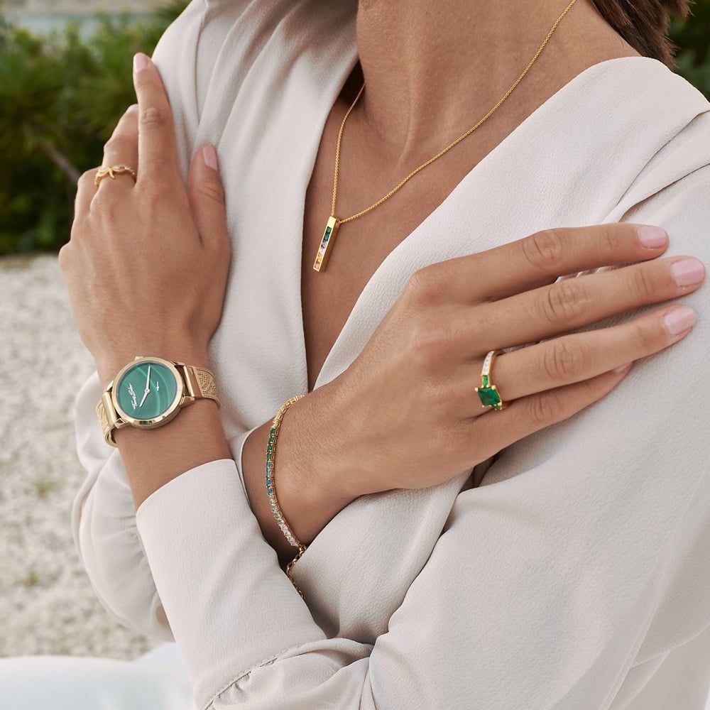This timeless dress ring has been created in 18k yellow gold-plated sterling silver & features three graduated sparkling princess-cut emerald-green glass-ceramic stones with a white cubic zirconia pave set shoulder design. Ideal for combining with other THOMAS SABO rings to create your own unique look.