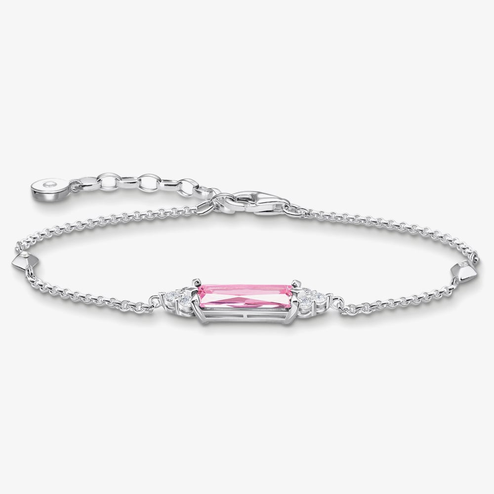 An elegant bracelet which has been created in sterling silver & features a sparkling octagon-cut pink cubic zirconia centre stone with a set of three white cubic zirconia stones either side & two stone set diamond shapes along the belcher chain bracelet. This bracelet is completed with a lobster clasp fastening & is adjustable from 16 to 19 cm to suit comfort & style.