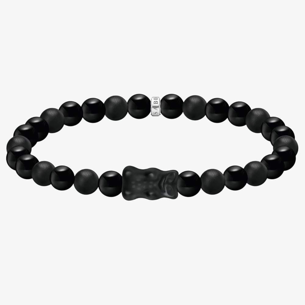 This eye-catching bracelet features smooth, polished black obsidian beads, known for their sleek elegance and grounding energy. At the centre, a playful black Haribo bear pendant. This bracelet is perfect for everyday wear or layering with other pieces. A stylish fusion of nostalgia and modern design, it makes a unique gift or a standout addition to any jewellery collection.