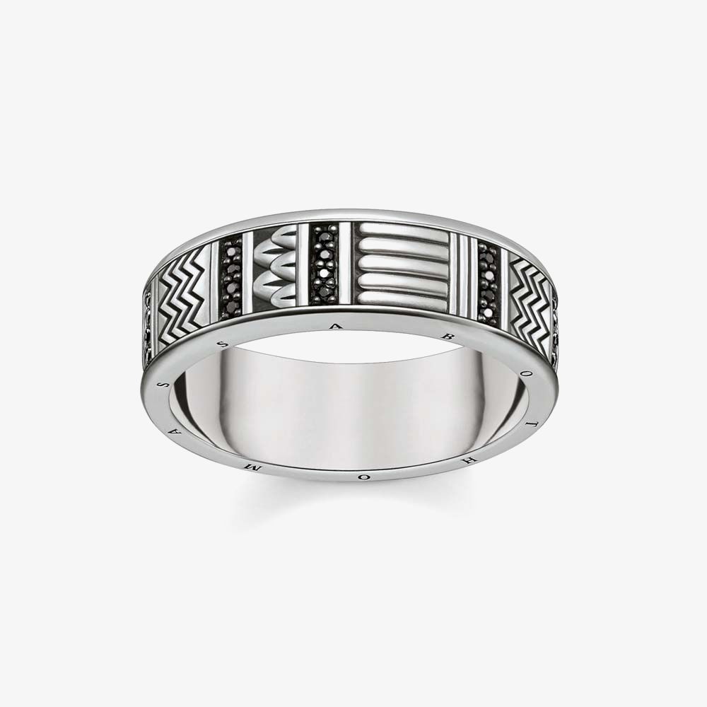 Adorn your outfit with this contrasting light and dark hieroglyphic display from THOMAS SABO. The ring is crafted from a wide sterling silver band which also incorporates the THOMAS SABO engraving and tiny black cubic zirconia stones for extra detailing.