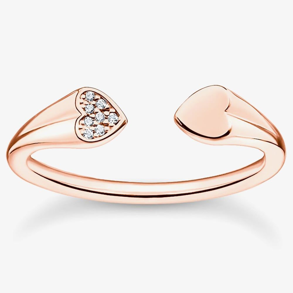 This attractive dress ring has been created in 18k rose gold-plated sterling silver & features an open cuff design that has two hearts on each end with one is set with pave set white cubic zirconia stones. Ideal for layering & combining with other THOMAS SABO rings to create your own unique look.
