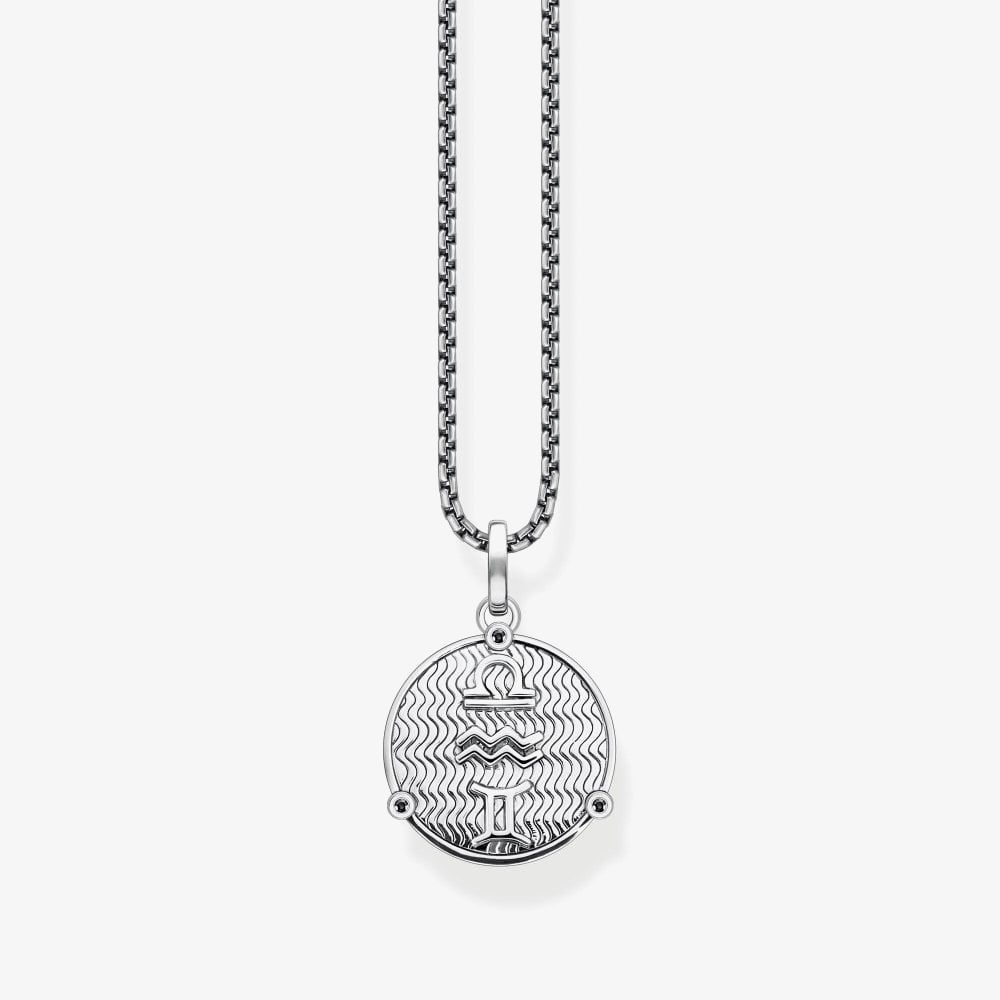 THOMAS SABO Men’s Rebel at Heart Necklace KE2149-643-11-L50V has an adjustable sterling silver belcher chain, measuring from 45cm to 50cm in length. This necklace includes a coin pendant featuring black cubic zirconia detailing surrounded by finely engraved lines. On the opposite side of the coin features three zodiac air signs, Libra, Aquarius and Gemini, on a silver relief. Dimensions: Width: 1.50 cm. Height: 2.20 cm. Total weight: 8.023g.
