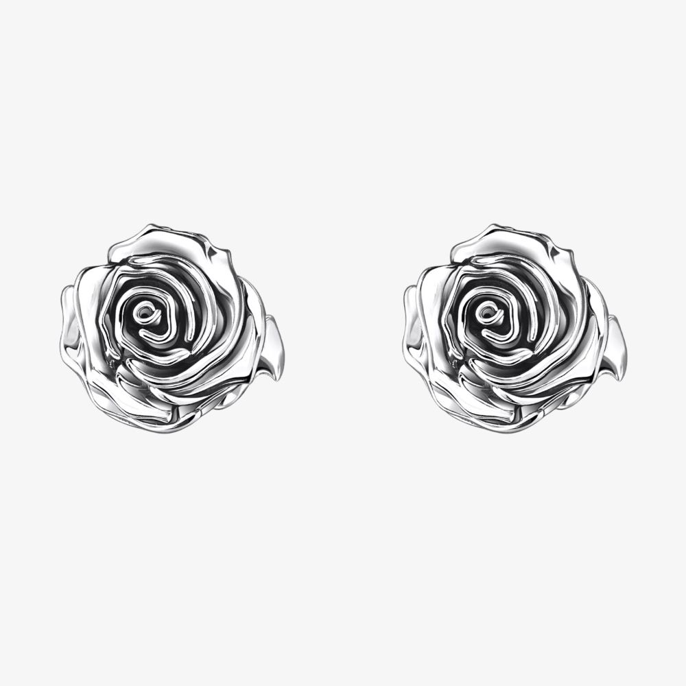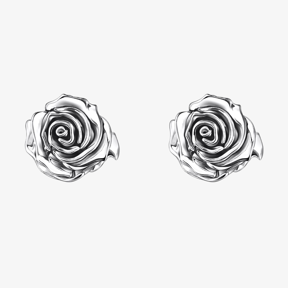Rose Ear Studs in Blackened Silver – Crafted from recycled silver, these intricately designed, three-dimensional rose-shaped ear studs are inspired by the beauty of nature. The rose, rich in symbolism, lets you tell your unique story. Perfect alone or paired with matching jewellery.