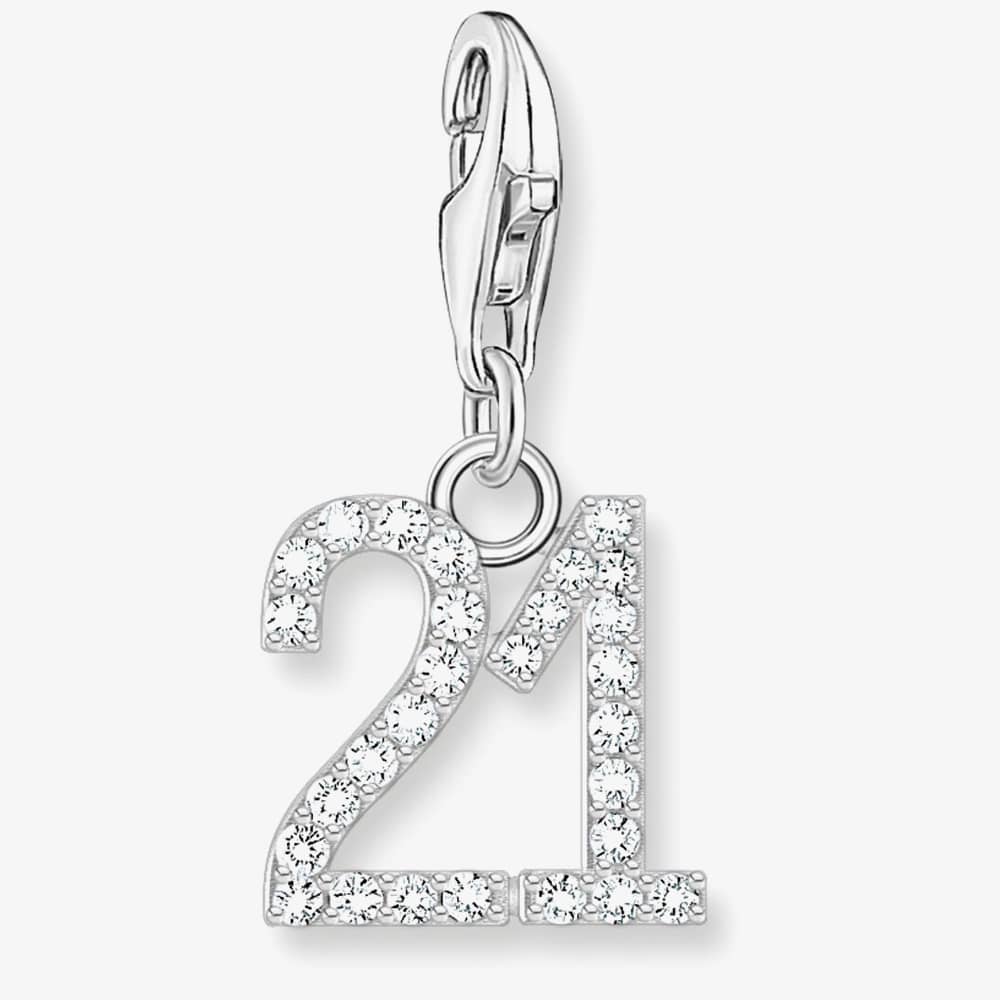 This charm, designed for your 21st birthday, serves as a reminder of these special thoughts and feelings. Crafted from recycled silver, it takes the shape of the number 21 and is adorned with sparkling white zirconia stones.