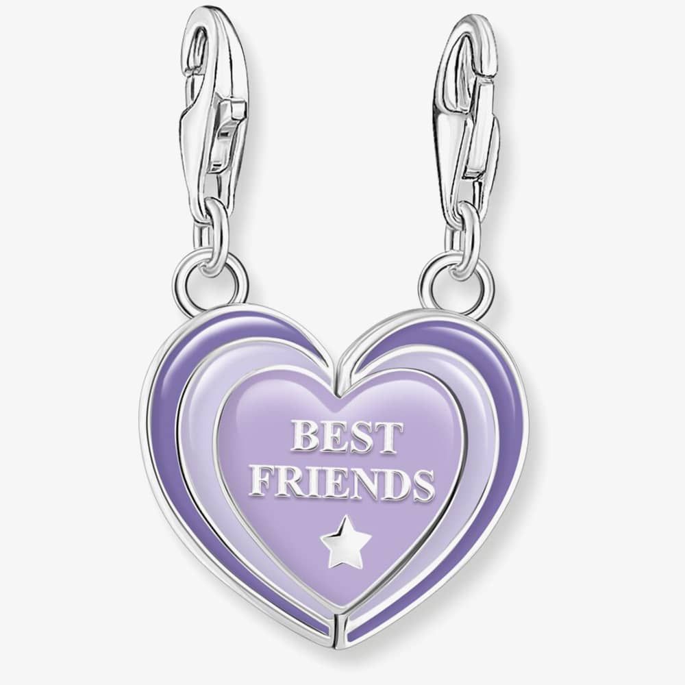 Crafted from top-tier 925 Sterling silver with a touch of subtle blackening, this heart-shaped pendant features the engraving "BEST FRIENDS," along with a star and luminescent violet cold enamel that adds a glowing charm to the heart. With its snap hook, it easily attaches to Charm Club necklaces and bracelets, whether worn individually or combined with other charms. Two of these Best Friends charms can be joined together.