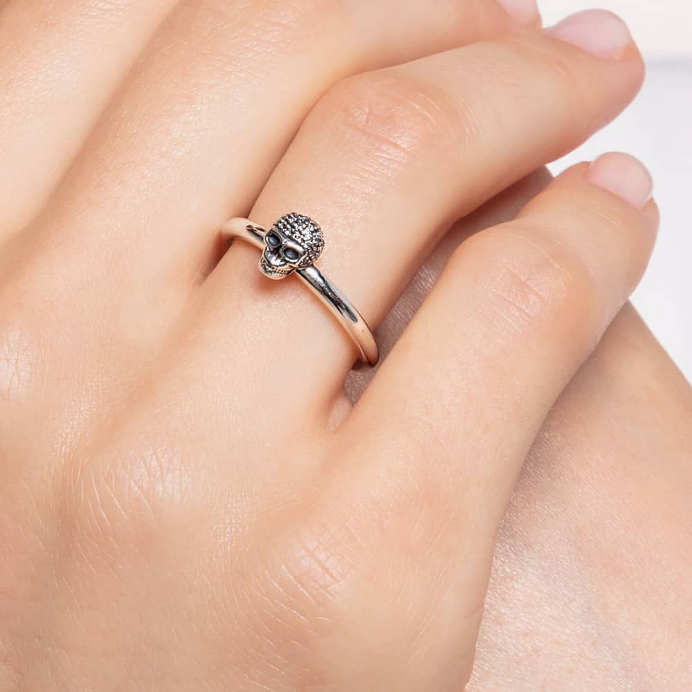 Exude a rock & roll attitude with this sparkling skull ring. Created in sterling silver, the ring boasts a skull shaped motif that is encrusted with sparkling cubic zirconia crystals. Wear the ring individually or pair with matching items from the Charming Collection for a striking finish to your everyday look.