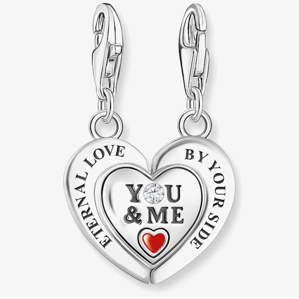 This heart-shaped charm, crafted from slightly oxidised recycled silver, boasts intricate detailing. On its front, it bears the engraving "ETERNAL LOVE" and the embellished lettering "YOU & ME," featuring a white cubic zirconia stone. Enhancing the emotional message, a small heart with cold red enamel is complemented by the engraving "BY YOUR SIDE" and an infinity symbol on the charm's back. The standout feature is its versatility, allowing seamless pairing with additional "You & Me" charms.