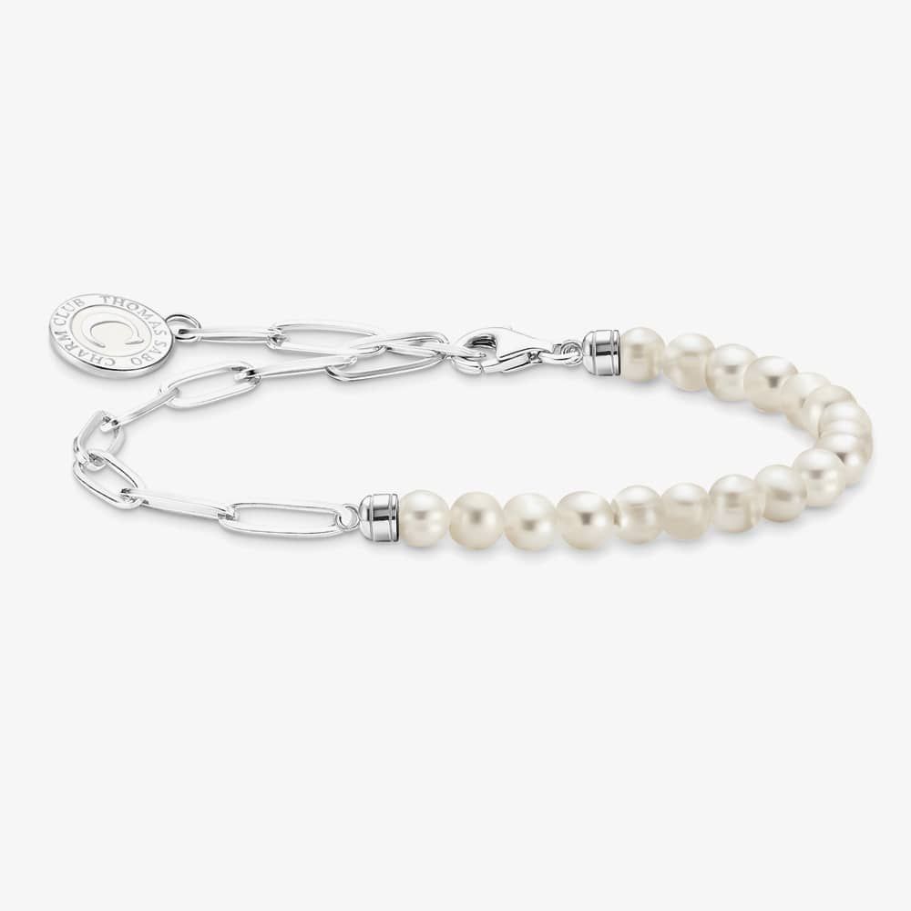 The THOMAS SABO charm bracelet is made from polished sterling silver and freshwater pearls, allowing the pendant charms to be mixed and matched on the long anchor-style links. The chain is adjustable in length, with a round, engraved THOMAS SABO Charm Club Charmista coin hand-painted with shimmering white-cold enamel at the end of the chain.