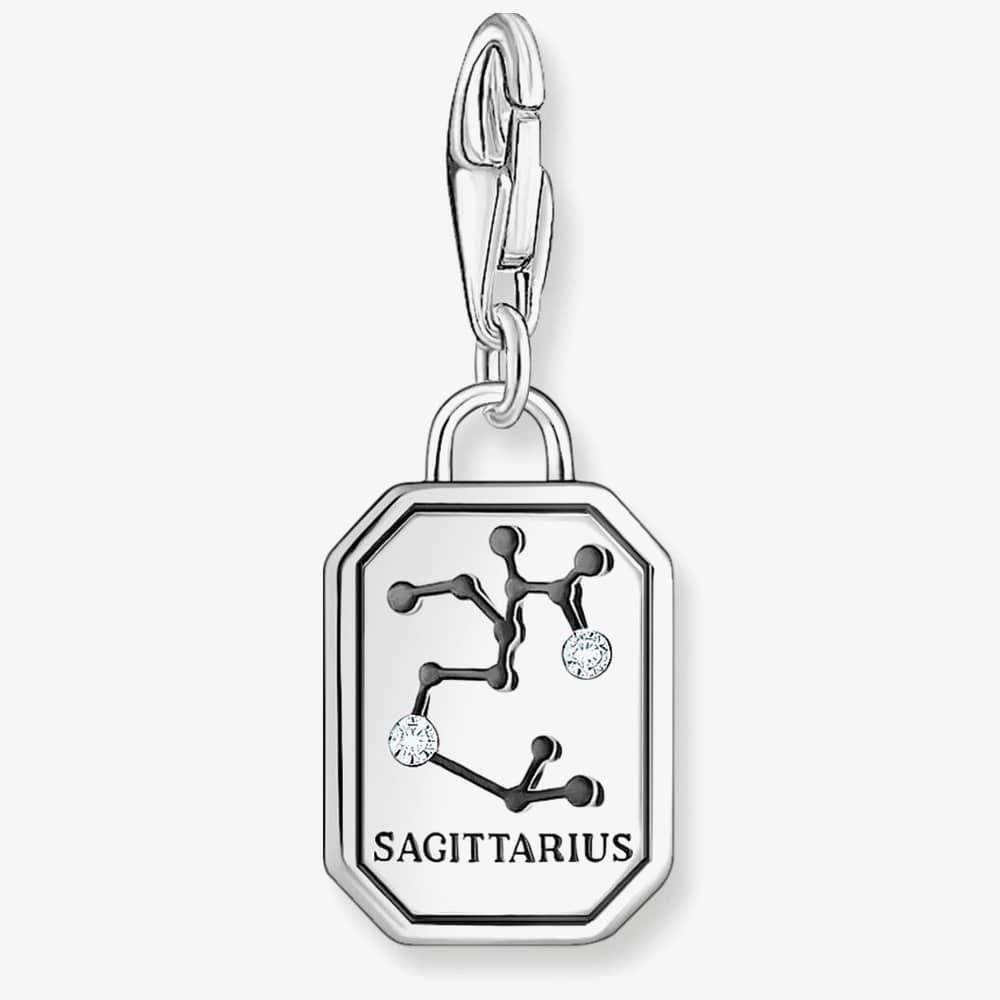 This octagonal-shaped charm is crafted from recycled silver with a slightly blackened finish, this exquisite charm features the iconic Sagittarius zodiac sign adorned with small, sparkling white zirconia stones. Perfect for adding a touch of celestial elegance to your charm bracelet or necklace.