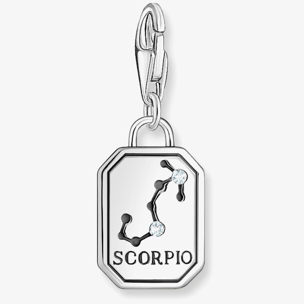 This octagonal-shaped charm is crafted from recycled silver with a slightly blackened finish, this exquisite charm features the iconic Scorpio zodiac sign adorned with small, sparkling white zirconia stones. Perfect for adding a touch of celestial elegance to your charm bracelet or necklace.