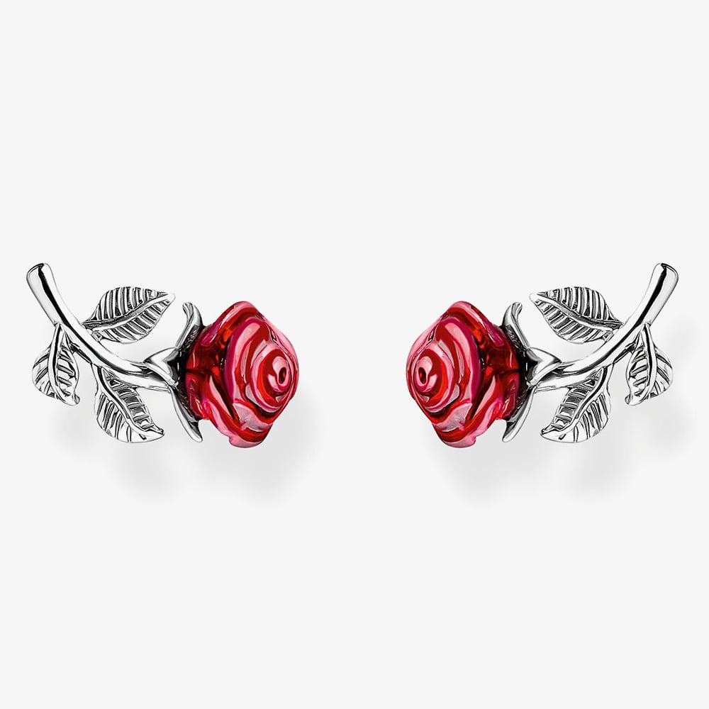These rose ear studs, crafted from recycled blackened silver, feature a Victorian-inspired design with a hand-painted red enamel rose and fine line details. The push-back clasp makes them easy to wear, while their dramatic design adds a bold, emotional touch to any look.
