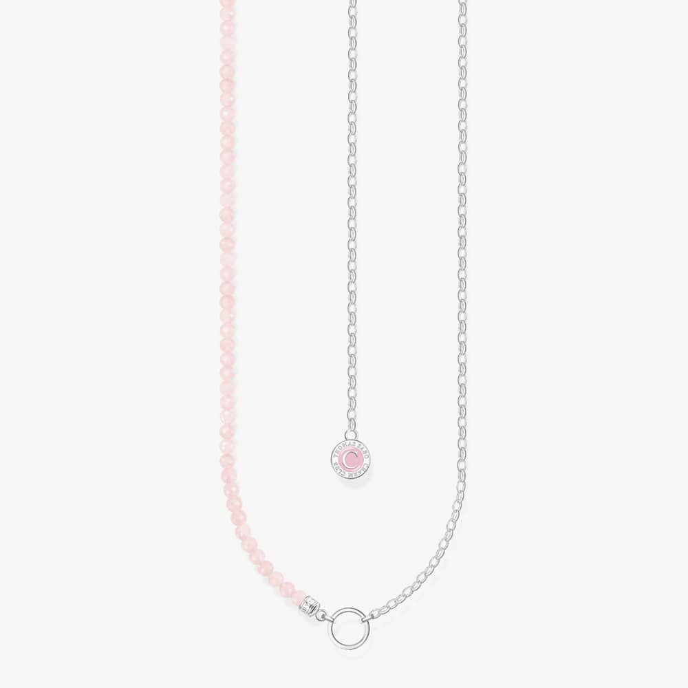 The THOMAS SABO Charmista necklace features a combination of a sterling silver link chain with rose quartz beading. Adorning the necklace is a round link that can attach different charm pendants. The chain is adjustable, measuring 40–45 cm, with a round, engraved THOMAS SABO Charm Club Charmista coin hand-painted with pink-cold enamel at the end of the chain.