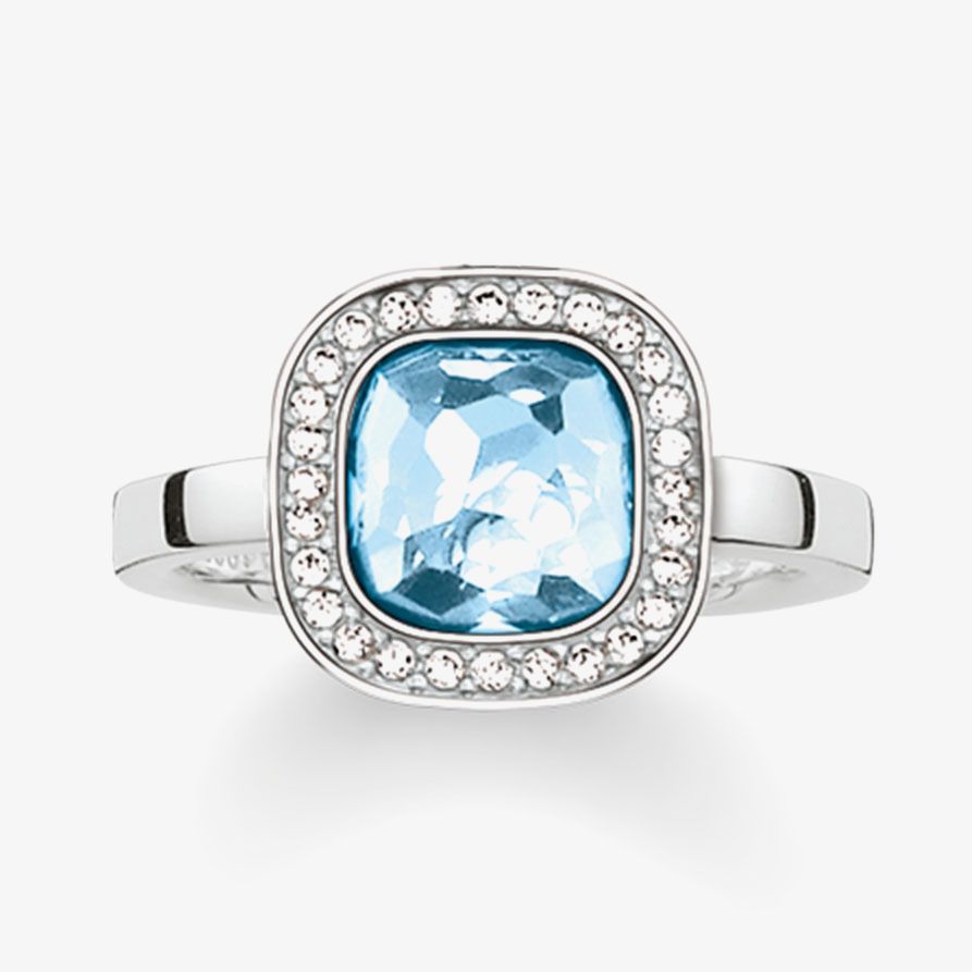 Crafted from sterling silver, this unique ring is brought to us by THOMAS SABO. This beautiful ring features a large sparkling blue Cubic Zirconia, surrounded by smaller shimmering clear Cubic Zirconia for that added touch of sparkle.