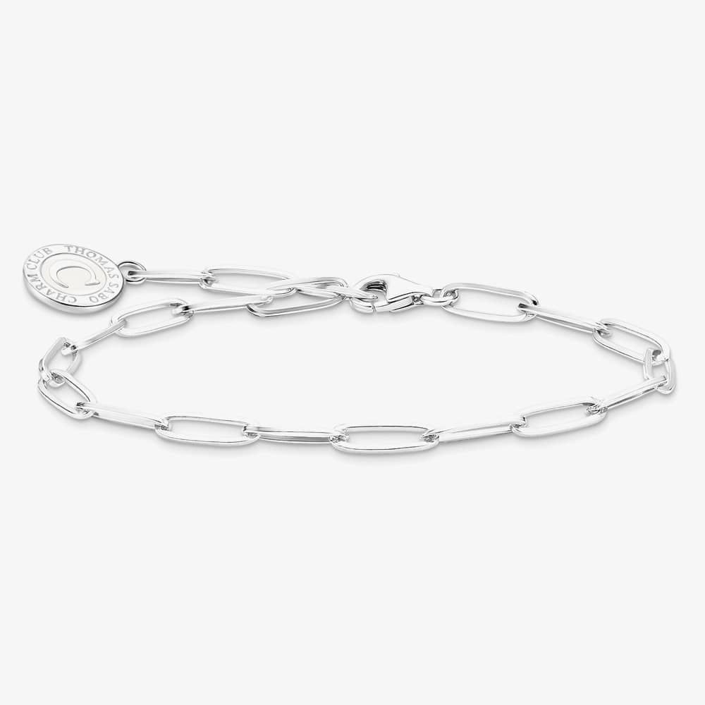 The THOMAS SABO Charmista charm bracelet is made from polished sterling silver, allowing the pendant charms to be mixed and matched on the long anchor-style links. The chain is adjustable in length, with a round, engraved THOMAS SABO Charm Club Charmista coin hand-painted with shimmering white-cold enamel at the end of the chain.