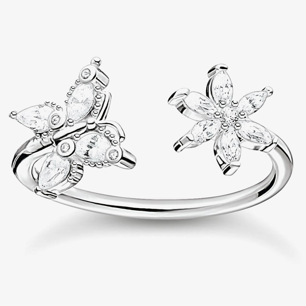 THOMAS SABO bring us this stylish open ring. Created in 925 Sterling Silver featuring a butterfly and flower design with sparkling white cubic zirconia stones. Wear individually or combine with other rings to create an en-vogue stacking look.