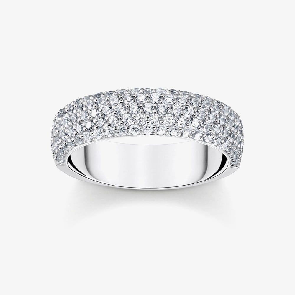 Celebrate timeless beauty with this ring, designed to become your favourite piece of jewellery by complementing your personal style. The ring features fine white zirconia pavé encircling the upper side, while the underside is engraved with the THOMAS SABO logo. Measuring 5.5 mm wide and crafted from recycled silver, it embodies the essence of the THOMAS SABO brand, merging elegance, sophistication, and a contemporary flair.
