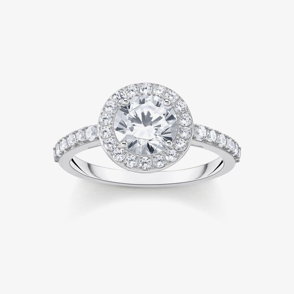 This striking halo ring, crafted from recycled silver, is sure to capture attention. At its center is a brilliantly cut white zirconia stone, encircled by smaller white zirconia stones. The band is also embellished with these tiny sparkling stones. This elegant and luxurious ring enhances any outfit, whether you're dressing for business, casual wear, or a special occasion. Wear it as a statement piece to elevate your look.
