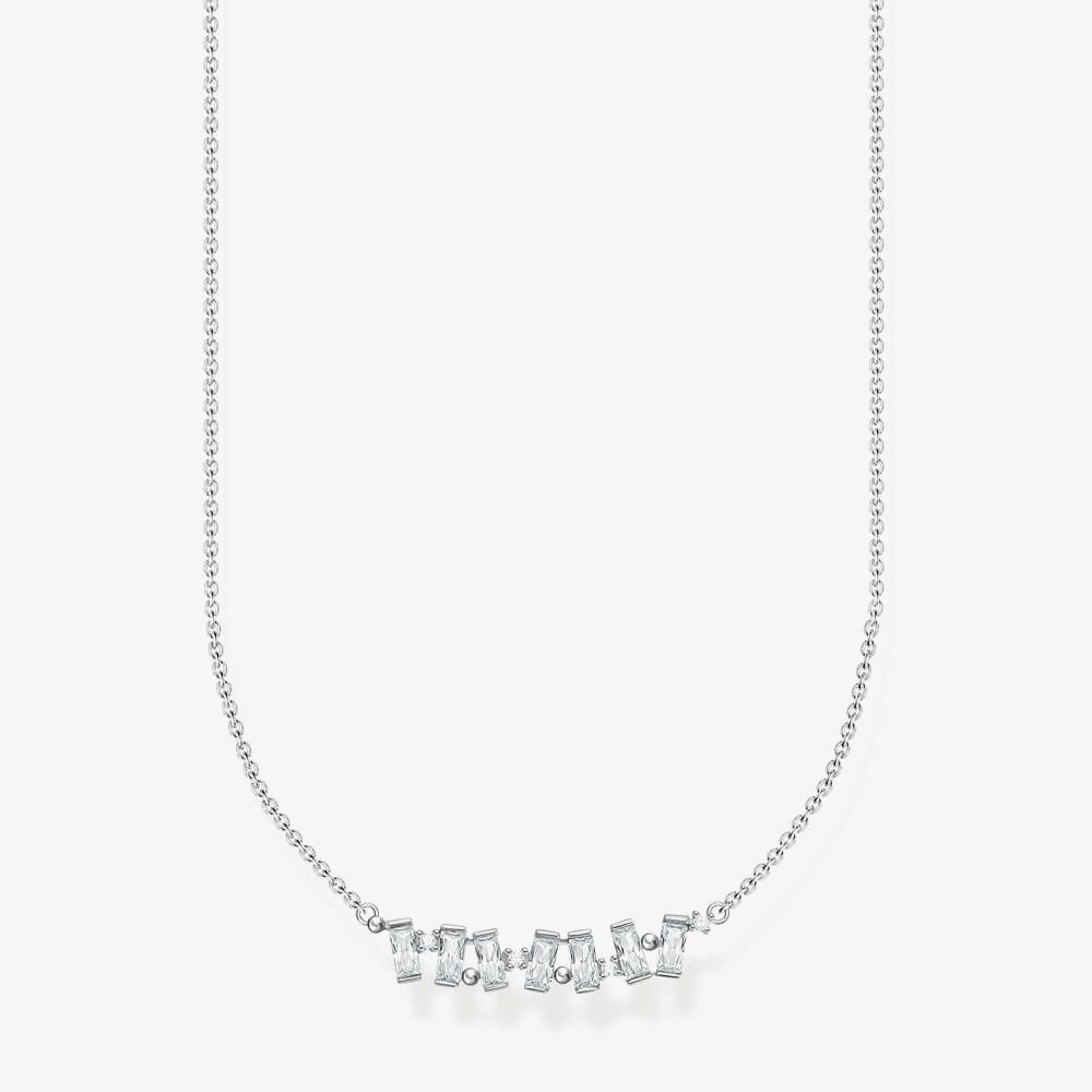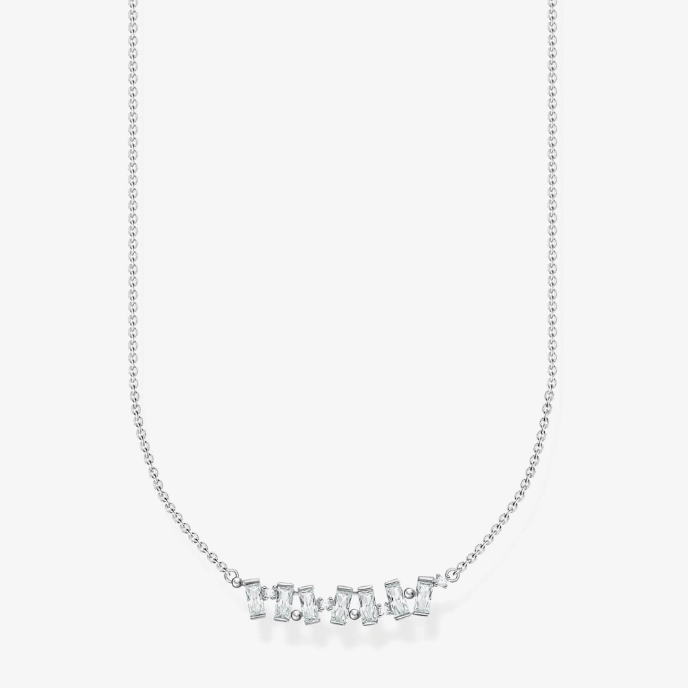 This Sterling Silver necklace is bought to us by THOMAS SABO. Featuring seven sparkling white baguette cubic zirconia stones. The length is adjustable from 38 cm to 42 cm.