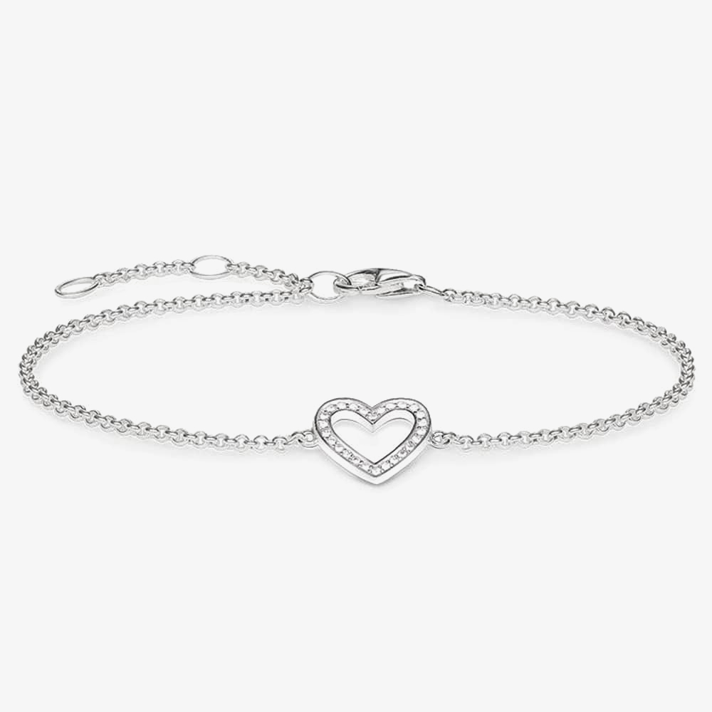 This beautifully feminine bracelet is crafted in sterling silver and features a cut out heart shaped pendant adorned with pavé zirconia stones. The bracelet is finished with an adjustable lobster clasp fastening, allowing the bracelet to envelope the wrist perfectly.