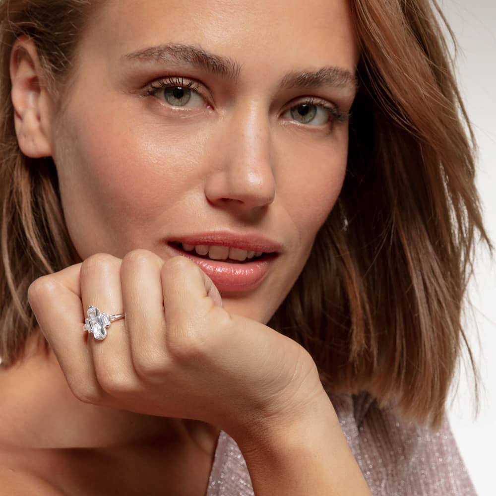 Composed with a bright sparkling baguette shaped zirconia stone that is hand faceted by hand in an octagon cut. the larger centre stone is framed by two smaller stones in a baguette cut. Small star details add a sparkling finish.