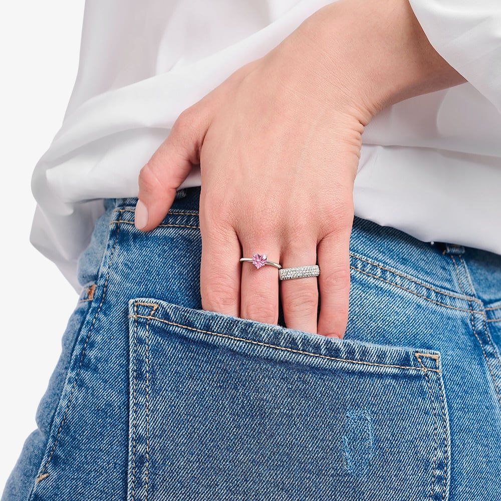 Romantic statement: This ring, crafted from recycled silver, features a heart-cut pink zirconia that sparkles with intense brilliance. The vibrant shine highlights the symbol of love, expressing deep emotions. This timeless heart-shaped ring enhances any outfit, making it an ideal gift for someone special.