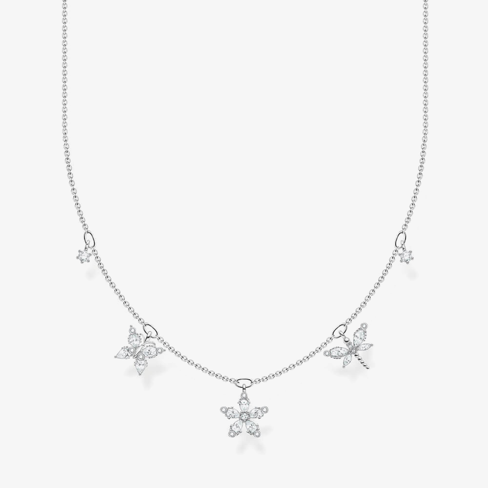 THOMAS SABO bring us this delicate filigree necklace. Created from Sterling Silver with white cubic zirconia flower, butterfly and dragonfly details. The length is adjustable from 40 cm to 45 cm.