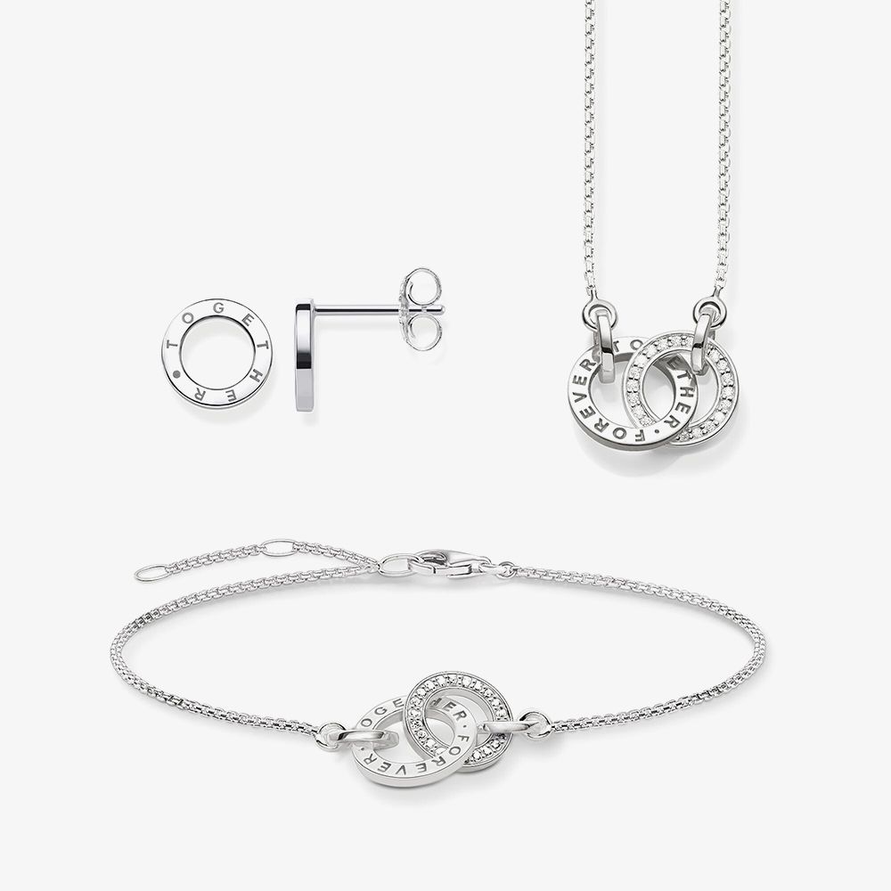 United Forever. This gorgeous ladies necklace consists of two interlocking hollow circle pendants made from sterling silver material. One contains the quote together forever whereas the other is set with several small and sparkling cubic zirconia stones.