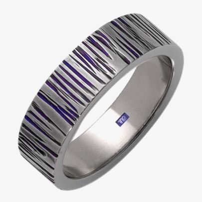 Bark textured blue anodised grooves run across the width of this stylish ring - the latest addition to the Ti2 Titanium ring. Its cool colour contrast will complement any outfit, be it day or night.