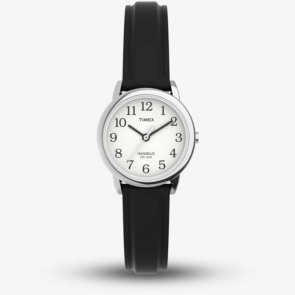 This Timex Easy Reader measures 25mm wide and combines a silver tone brass case with a black leather strap measuring 12mm wide. It comes with a light function, operated by pushing in the crown, and a 30 metre water resistance. Power is generated by the quartz movement.