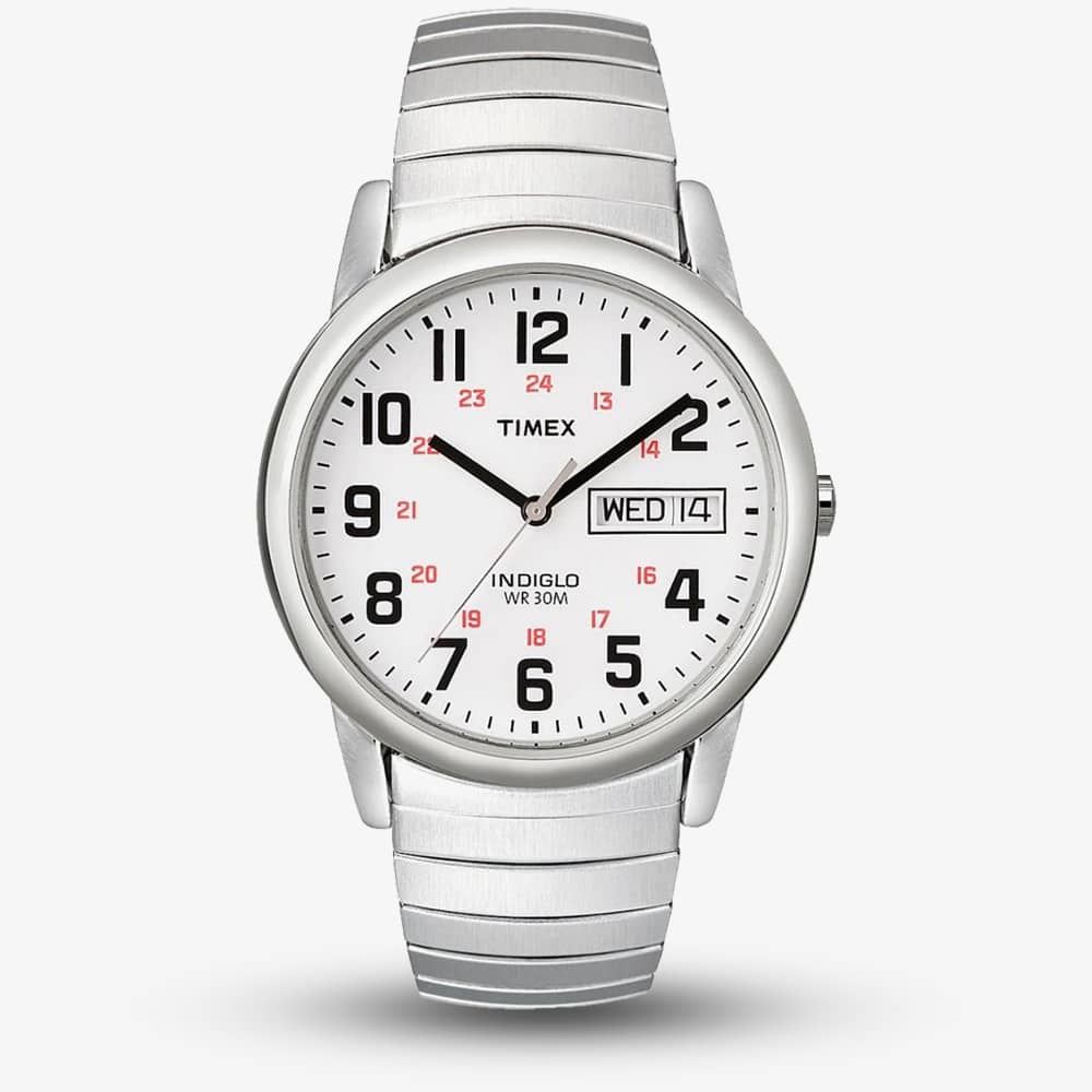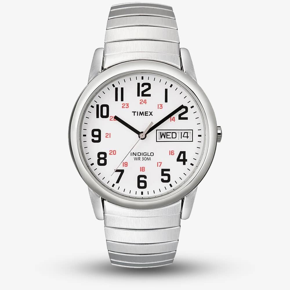 The Timex Easy Reader Expanding T20461D7 watch combines a 35mm round shaped brass case and stainless-steel expandable bracelet. It has a white analogue dial with a day date display which is protected beneath a mineral crystal glass. Power is generated by the quartz movement. Other features include back light. This model also has a water resistance of up to 30 metres.