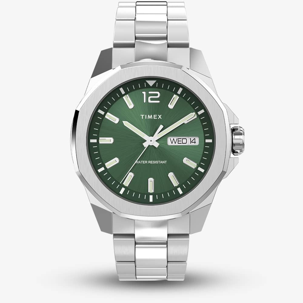 Timex’s renowned durability and build quality is brought to life with this contemporary and sophisticated watch, composed of a two-piece case construction with an octagonal bezel. This item has a stainless steel bracelet with fold over clasp, a crown protector, and vertical brushed finish, offering great finer details. The green sunray dial also has a day/date display and luminescent hands, with power coming from the quartz movement and protection from the mineral crystal glass.