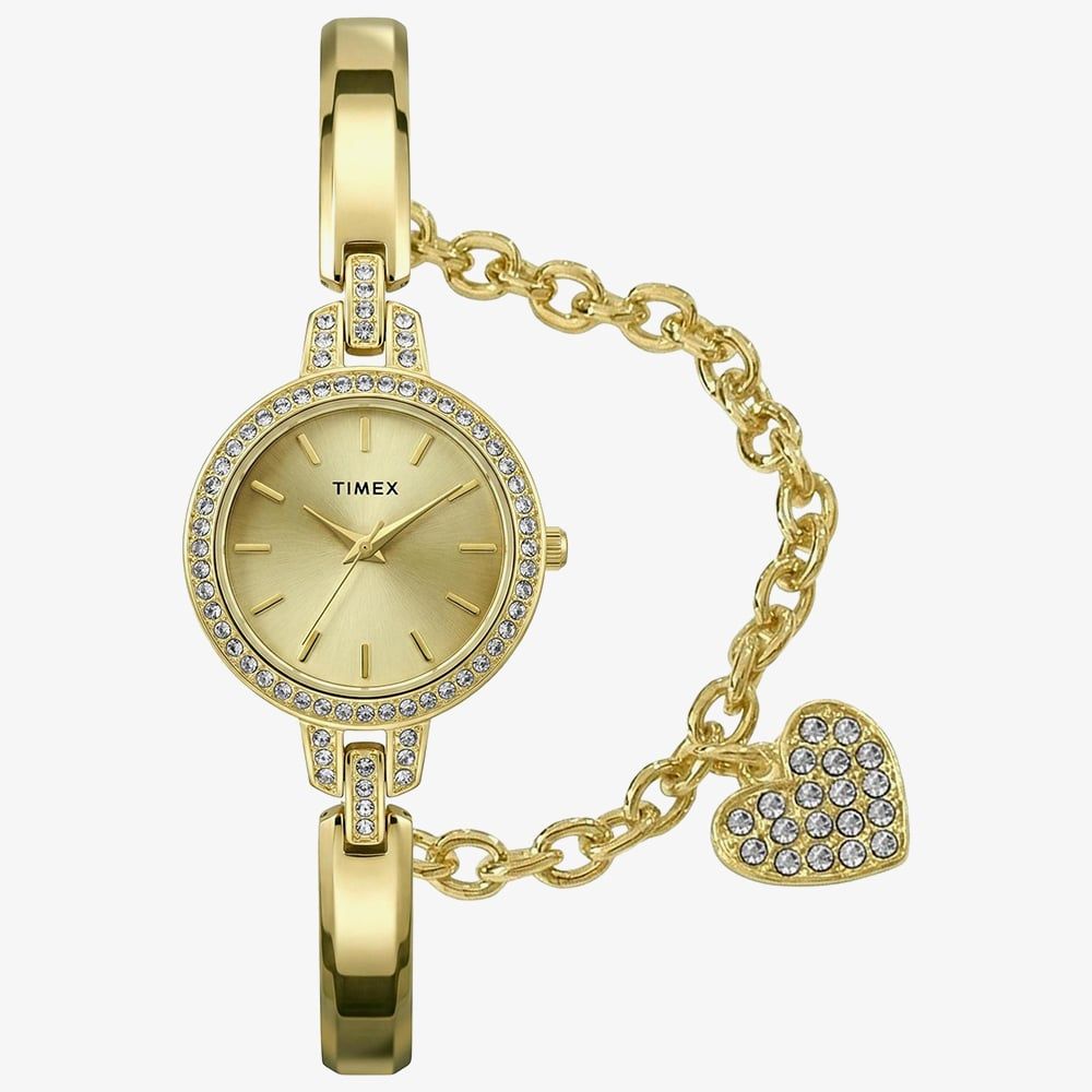 • 30 metre water resistance.Timexhttps://www.thbaker.co.uk/media/catalog/product/2/1/21-48-25156490_timex_02.jpg0194366475555condition:Nodisc_no_stock:Noex_display:NoNoNoNo214825156490TimexTWG067900LadiesOfficial Timex Packaging12 Month Timex WarrantyFashionNoWatchGoldMetal Alloy BraceletMetal AlloyRound7.7mm28.0mmAnalogueMineral Crystal GlassGoldGold30 metresQuartzJewellery ClaspWhiteCrystalNoNoNoNoNoNoNo{"name":"Klarna","text":"3 payments of \u00a335","imageUrl":"https:\/\/www.thbaker.co.uk\/media\/nosto\/klarna.png"}Timex Ladies Aveline Gold Tone Crystal Watch & Heart Bracelet Gift Set21-48-251564902026-03-25 00:00:000[{"path":"\/Watches","url":"\/watches\/"},{"path":"\/Seasonal\/Christmas Collection","url":"\/christmas-collection\/"},{"path":"\/Seasonal\/Valentines Collection","url":"\/valentines\/"},{"path":"\/Gifts","url":"\/gifts\/"},{"path":"\/Seasonal\/Mother's Day Gifts","url":"\/mothers-day\/"},{"path":"\/Watches\/Ladies Watches","url":"\/ladies-watches\/"},{"path":"\/Brands A-Z\/Timex","url":"\/timex-watches\/"},{"path":"\/Brands A-Z\/Timex\/Timex Analogue","url":"\/timex-analogue-watches\/"},{"path":"\/Watches\/Bracelet Watches","url":"\/bracelet-watches\/"},{"path":"\/Watches\/Quartz Watches","url":"\/quartz-watches\/"},{"path":"\/Watches\/Fashion Watches","url":"\/fashion-watches\/"},{"path":"\/Brands A-Z\/Timex\/Timex Ladies","url":"\/timex-ladies-watches\/"},{"path":"\/Gifts\/Gift Sets","url":"\/gift-sets\/"},{"path":"\/Watches\/Gold Watches","url":"\/gold-watches\/"},{"path":"\/Seasonal\/Mother's Day Gifts\/Hearts Collection","url":"\/hearts-collection\/"},{"path":"\/Seasonal\/Christmas Collection\/Christmas Gifts Sets","url":"\/christmas-gift-sets\/"},{"path":"\/Seasonal\/Valentines Collection\/Valentines Gift Sets","url":"\/valentines-gift-sets\/"},{"path":"\/Seasonal\/Mother's Day Gifts\/Mother's Day Gift Sets","url":"\/mothers-day-gift-sets\/"}]2026-03-25