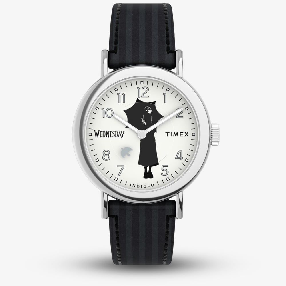 Inspired by the mysterious charm of the iconic character Wednesday Addams, this watch brings a gothic twist to the classic Weekender design. Featuring a sleek white dial with unique design details, this timepiece delivers both attitude and refinement. The black leather strap adds sophistication and edge, making it a perfect accessory for those who love to express individuality and add a touch of playfulness to their everyday style.