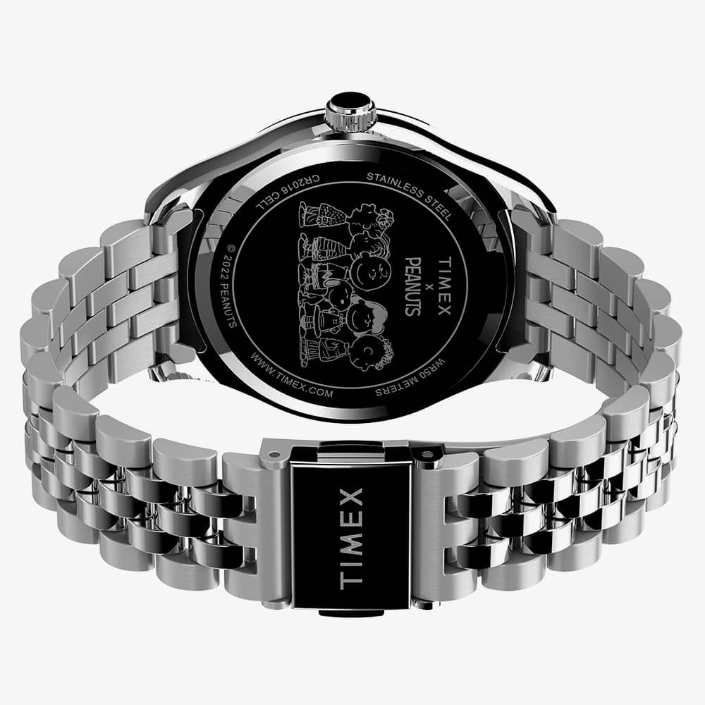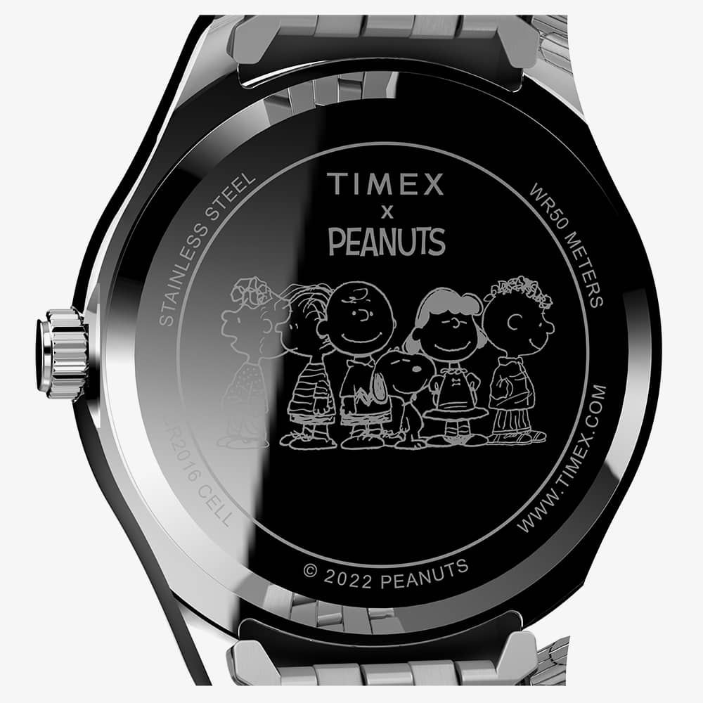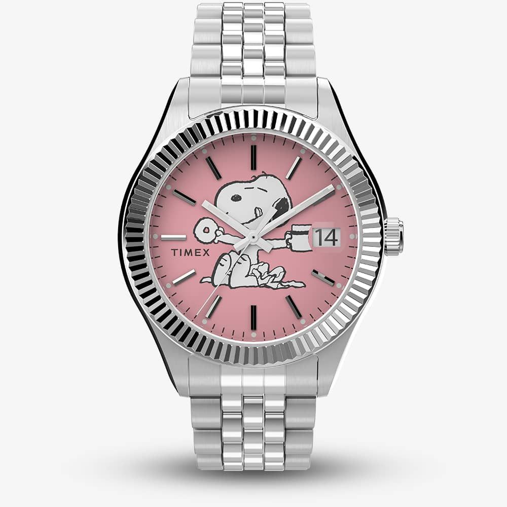 Timex has collaborated with Peanuts to create this cheerful pink dial watch featuring Snoopy. Composed of a 34mm stainless steel case and jubilee bracelet, the piece also has a fluted bezel, date display and luminescent hands. This is a must have for fans or collectors, as it also has the cast engraved onto the case back.