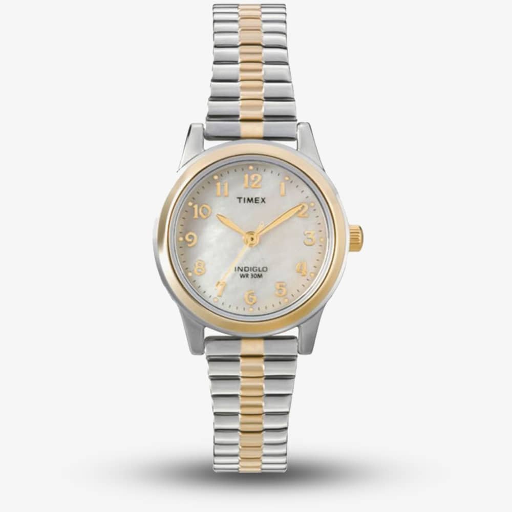 The Timex Main Street T2M828 watch combines a 25mm round shaped two-tone brass case and two-tone stainless steel expandable bracelet. It has a mother of pearl analogue dial with gold tone hands & Arabic numerals which are protected beneath a mineral crystal glass. Power is generated by the quartz movement. This model also has a water resistance of up to 30 metres.