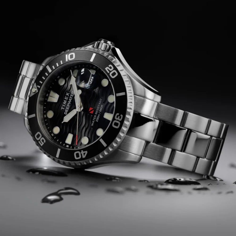 Engineered for performance and style, the Timex Deepwater Meridian 200 Watch features a striking black wave-pattern dial and matching black bezel. Its SuperLuminova® hands and indices ensure effortless readability in any light, while the screw-down crown and case back provide exceptional water protection. Expertly constructed to withstand pressures of up to 20 atmospheres, this robust timepiece delivers 200m water resistance, combining precision engineering with a bold, adventurous aesthetic.