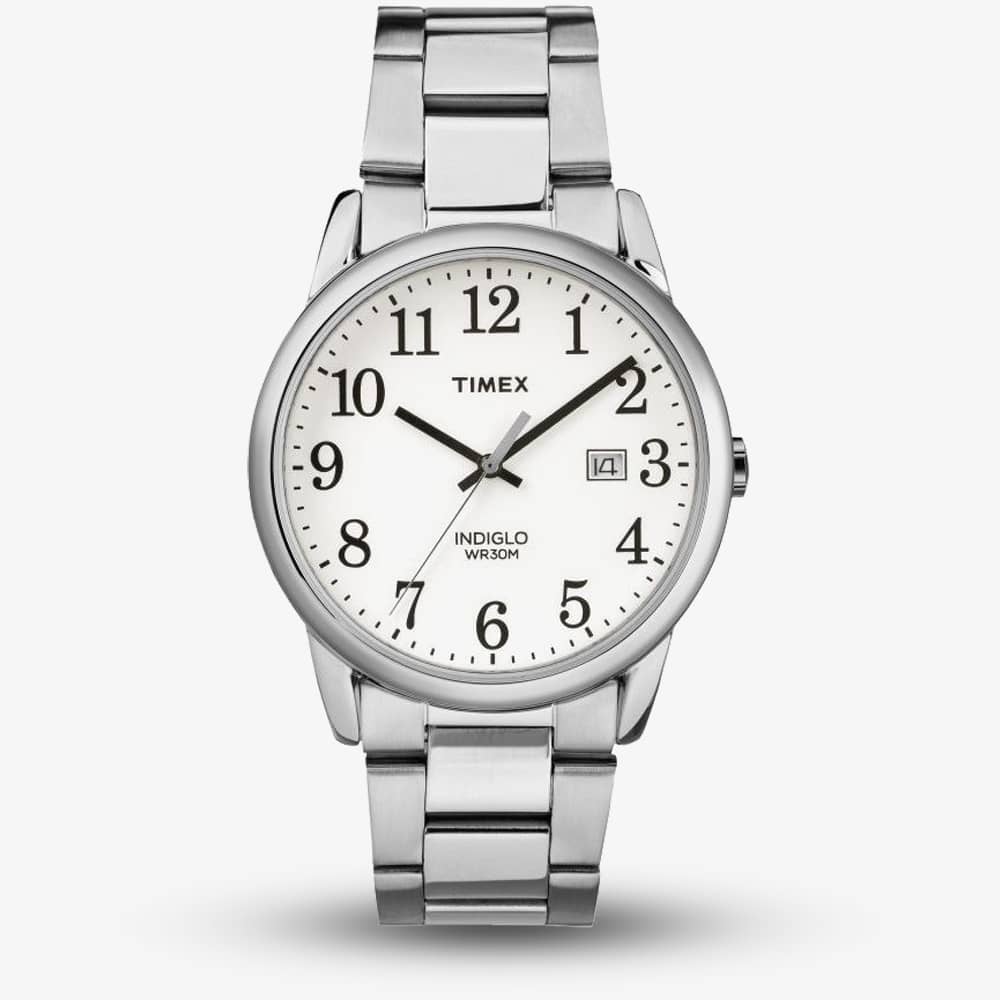The Timex Mens Easyreader White Dial TW2R23300 watch combines a 38mm round shaped stainless steel case and silver stainless steel bracelet with a push button deployment clasp. It has a white analogue dial which is protected beneath mineral crystal glass. Power is generated by the quartz movement. This model also has a water resistance of up to 30 metres.