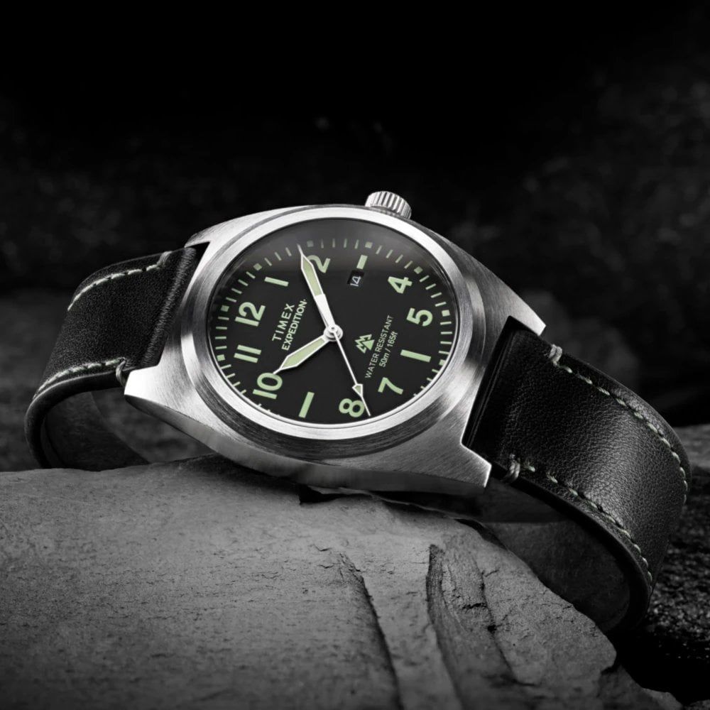 Embodying the rugged spirit of the great outdoors, the Expedition Capstone Modern is a timepiece built for resilience and clarity. The 40mm metal alloy case frames a black dial that features prominent, easy-to-read Arabic numerals and a convenient date display. Paired with a rich black leather strap, this watch offers a tactile warmth and a classic aesthetic that feels at home in any landscape, from forest trails to urban environments.