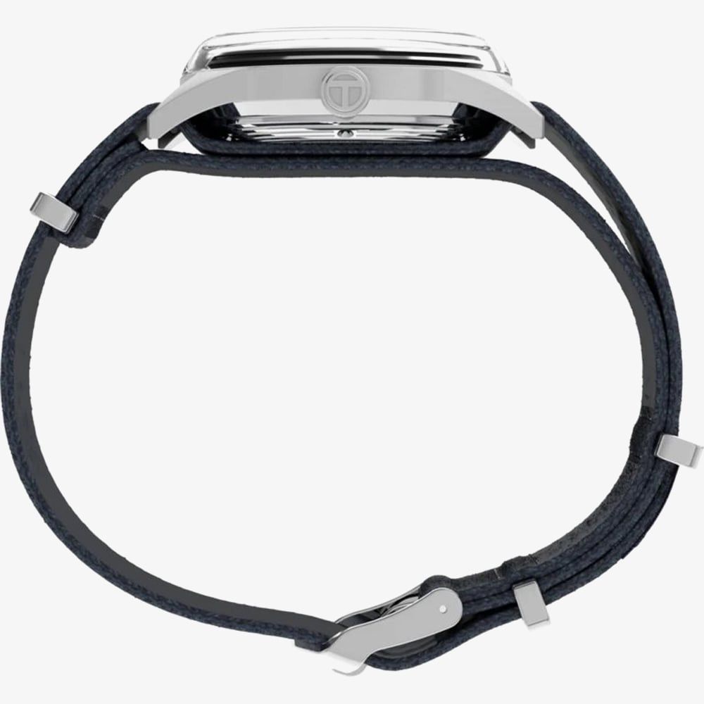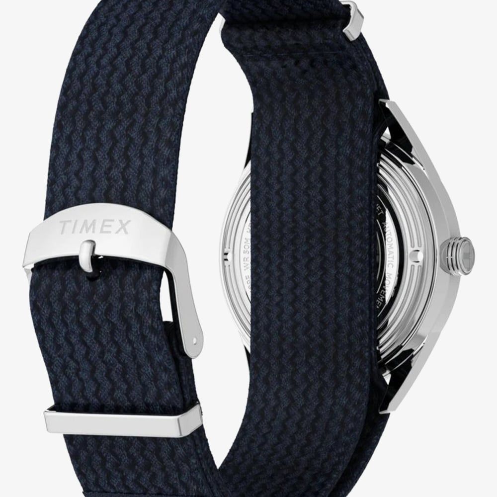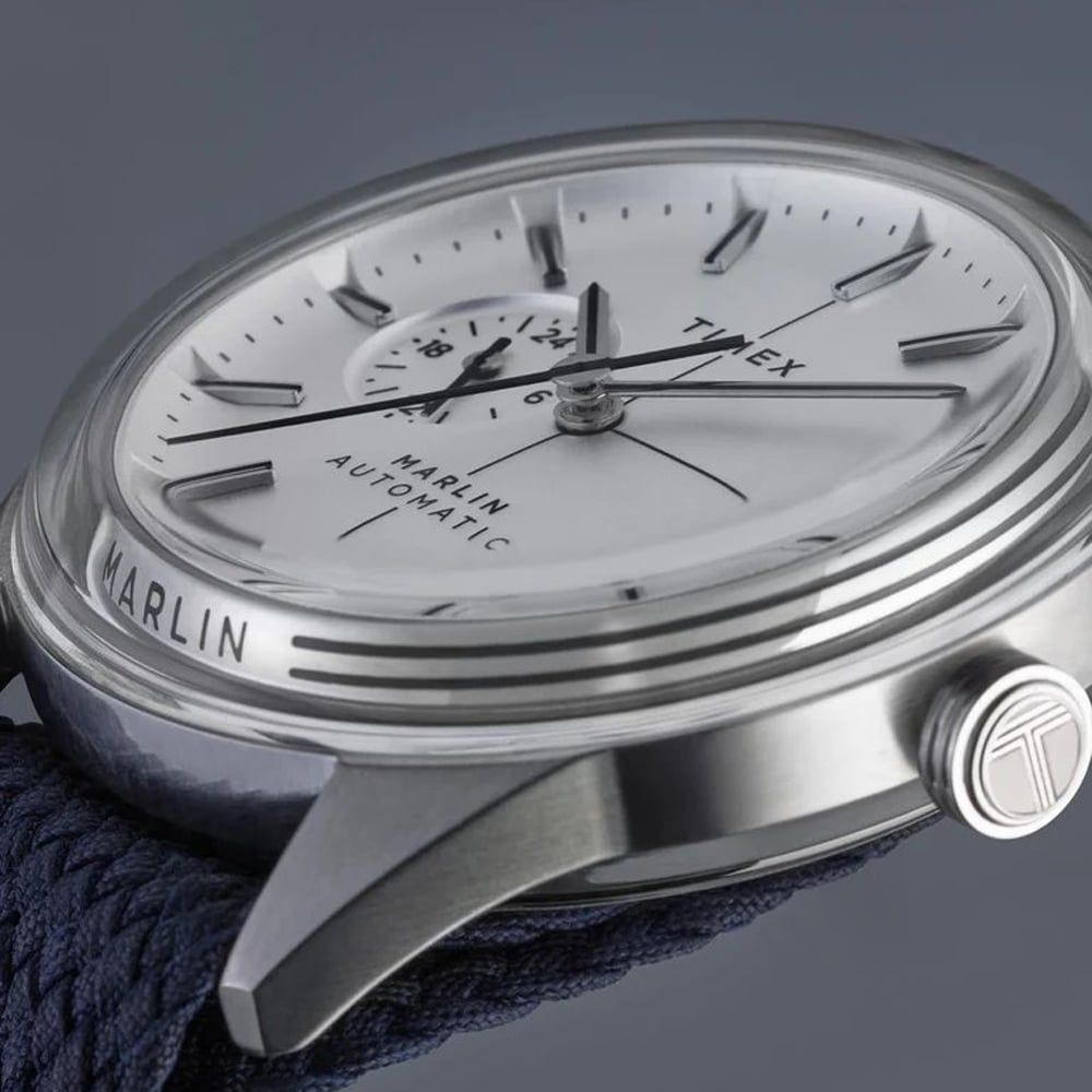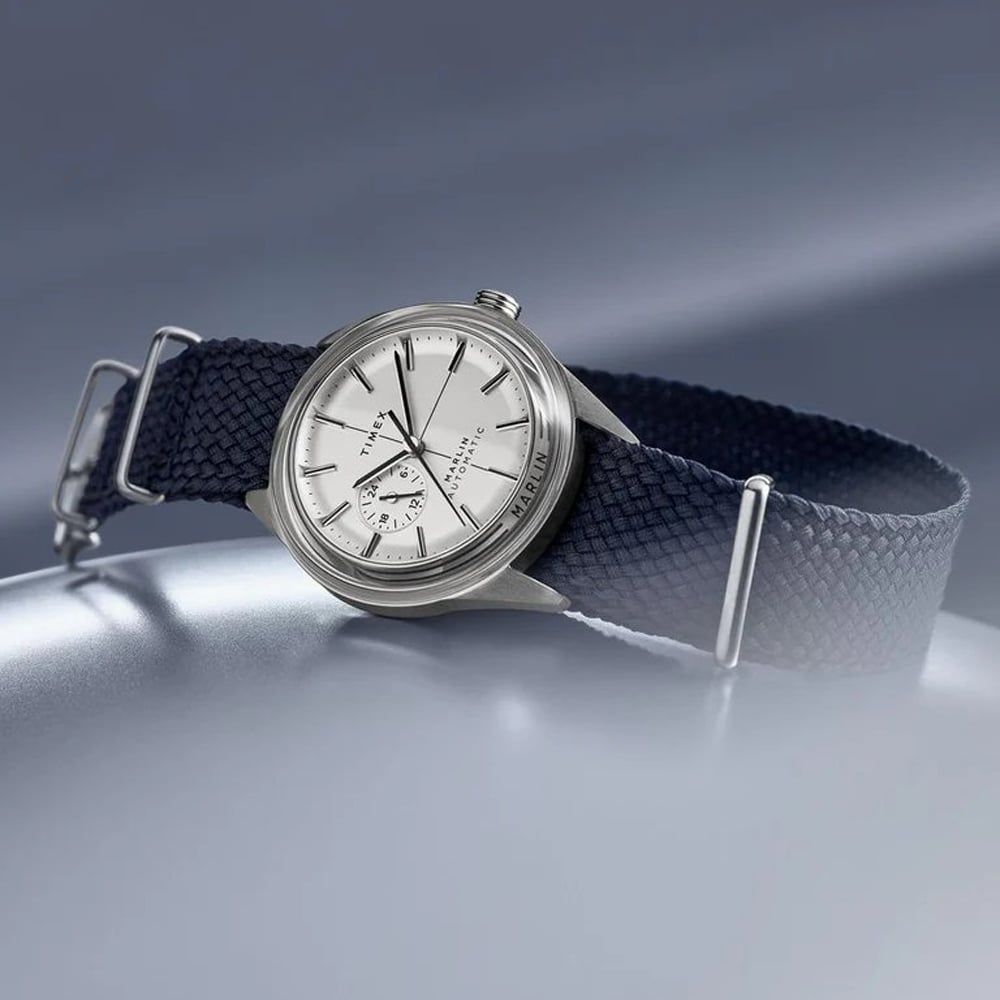 The Timex Marlin Jet fuses '60s futuristic design with modern appeal, featuring a 38mm brushed stainless-steel case and a domed Hesalite crystal that enhances its retro-futuristic style. The case is complemented by a grooved bezel and an exhibition case back, showcasing the inner workings. The silver-white concave dial includes a 24-hour sub-dial at 9 o'clock, adding depth to the design. Paired with a blue woven perlon strap, this timepiece offers a textured finish to its sleek look, blending timeless design with contemporary flair for a truly standout piece.