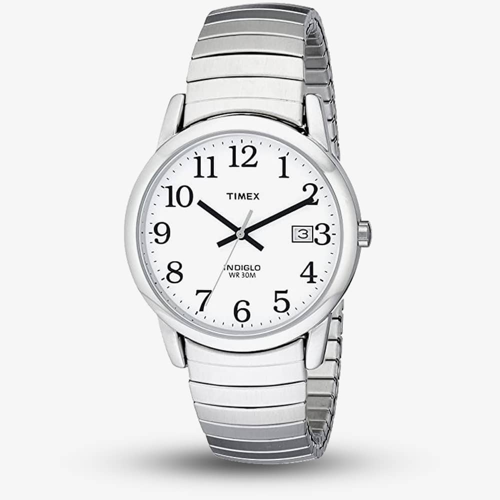 The Timex Mens Silver Bracelet T2H451 watch combines a 35mm round shaped stainless steel case and silver stainless steel bracelet with a push button deployment clasp. It has a white analogue dial which is protected beneath mineral crystal glass. Power is generated by the quartz movement. This model also has a water resistance of up to .