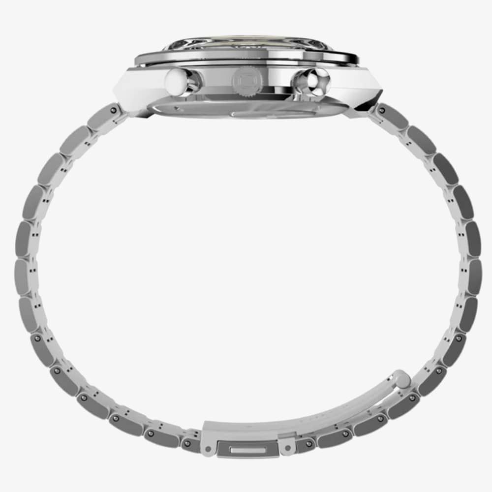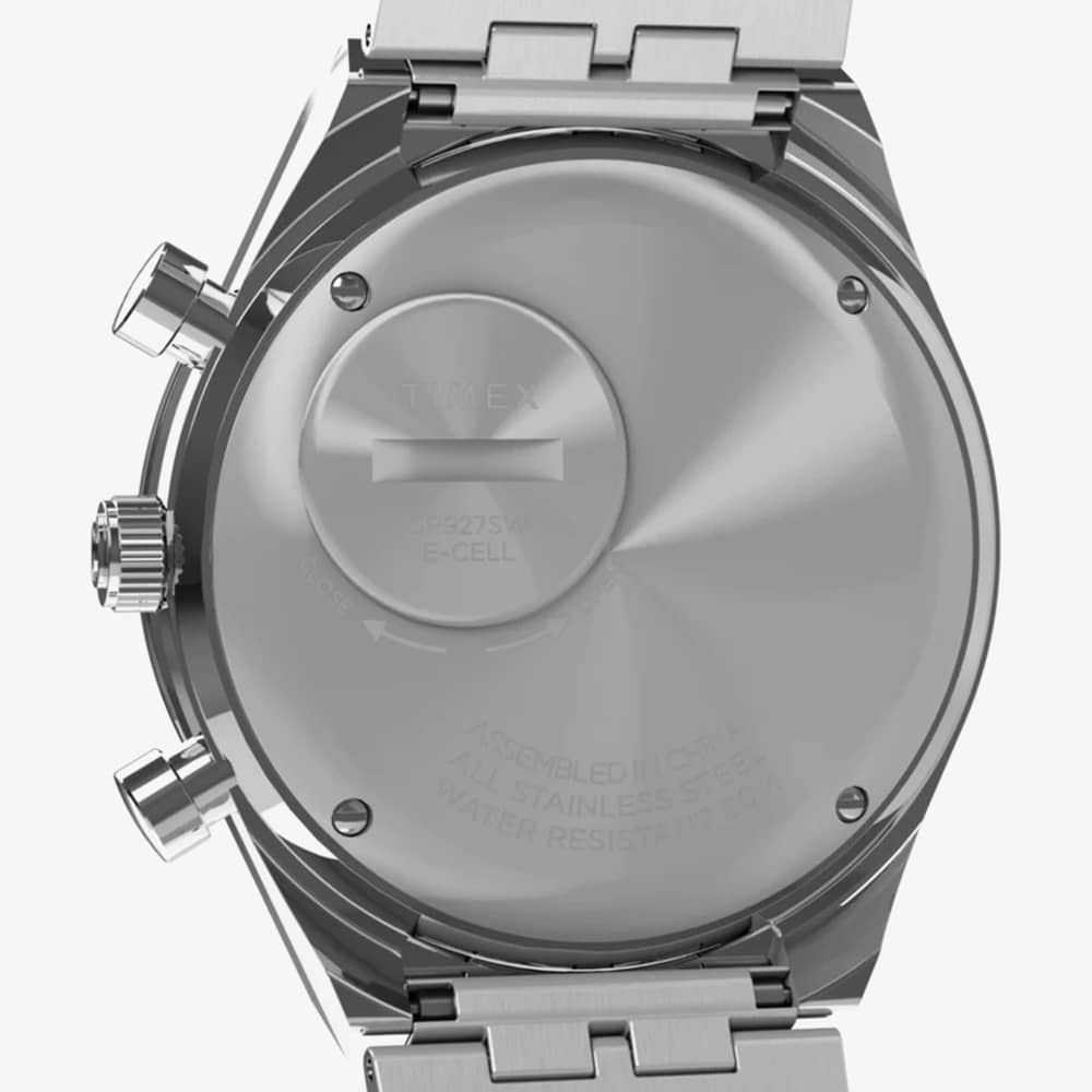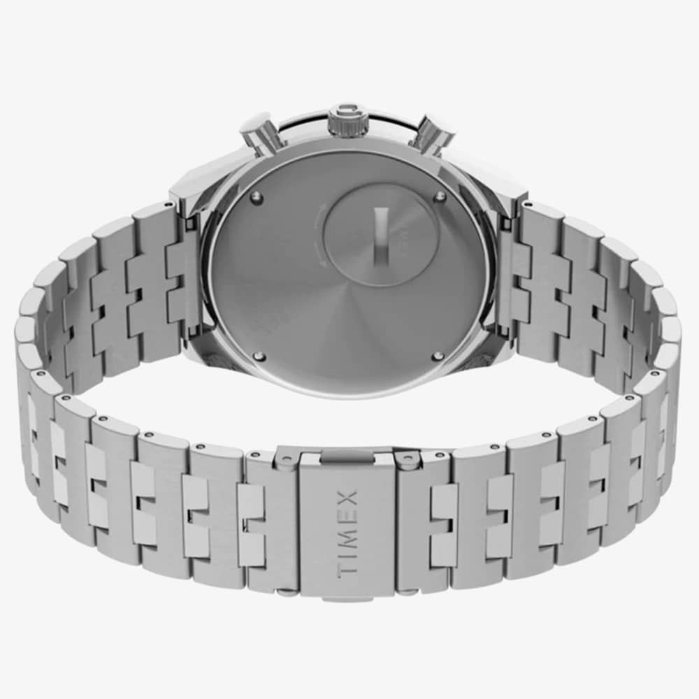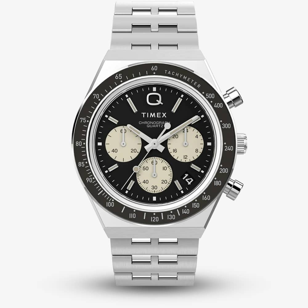 Based on the original motoring watch from the 1970s, the Q Timex combines an ultra-precise chronograph movement and black tachymeter bezel to recreate the form and function of a true racing watch. This example pairs a 40mm stainless steel case with a matching bracelet and a black dial with contrasting white chronograph sub-dials.
