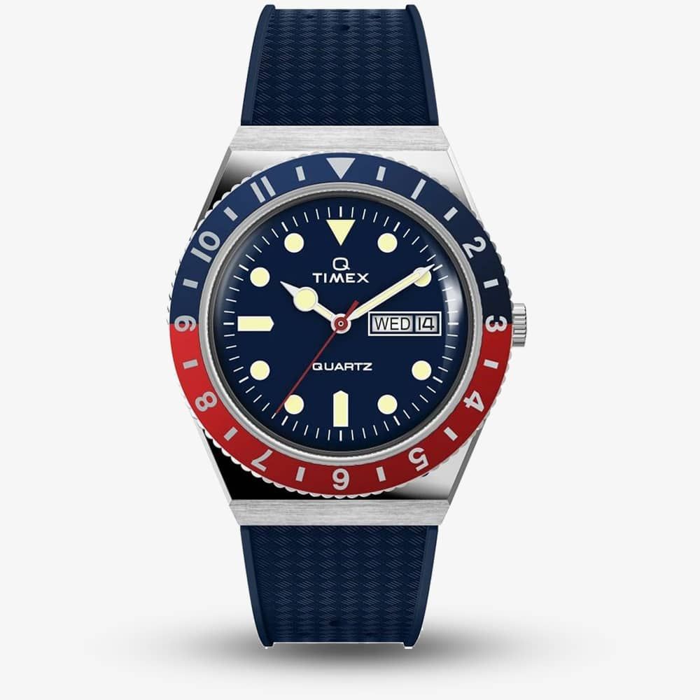 The Timex Q Diver TW2V321007 watch combines a 38mm round shaped brushed stainless-steel case with an aluminium blue & red bezel and a blue soft silicone rubber strap with a traditional buckle. It has a blue analogue dial with luminescent hands & day date display which are protected beneath an acrylic plastic glass. Power is generated by the quartz movement. This model also has a water resistance of up to 50 metres. Case Depth. 11.50mm.