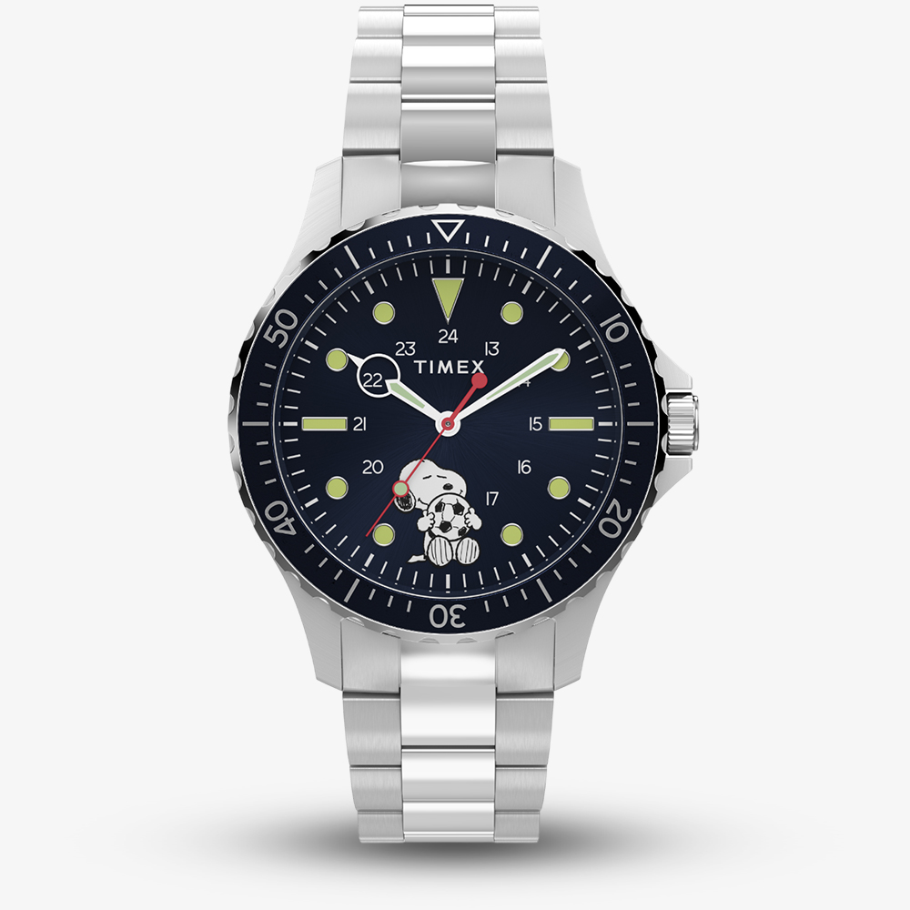 Timex celebrates the sport of soccer or football with this collaboration between Timex and the Peanuts franchise. A blue aluminium bezel surrounds the blue dial, which features Snoopy sat holding a ball with luminescent hands and hour markers. The stainless steel case measures 41mm wide and comes with a matching stainless steel bracelet with a push button clasp for a secure fit on the wrist.