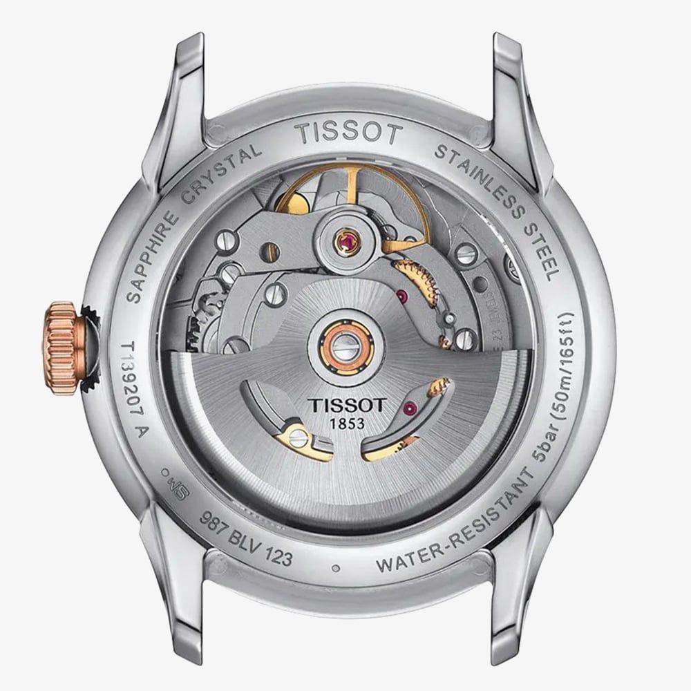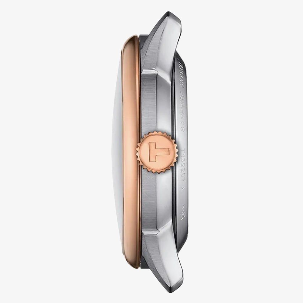 Inside, the Powermatic 80 automatic movement with Nivachron balance spring delivers up to 80 hours of power reserve alongside enhanced resistance to magnetism, supporting reliable everyday performance. The bicolour stainless steel bracelet combines cool steel with rose gold accents, offering a comfortable, fluid fit and a pleasing weight. Suited to those who appreciate timeless design and mechanical integrity, the Chemin des Tourelles T139.207.22.038.00 is a versatile companion for both professional and formal settings.