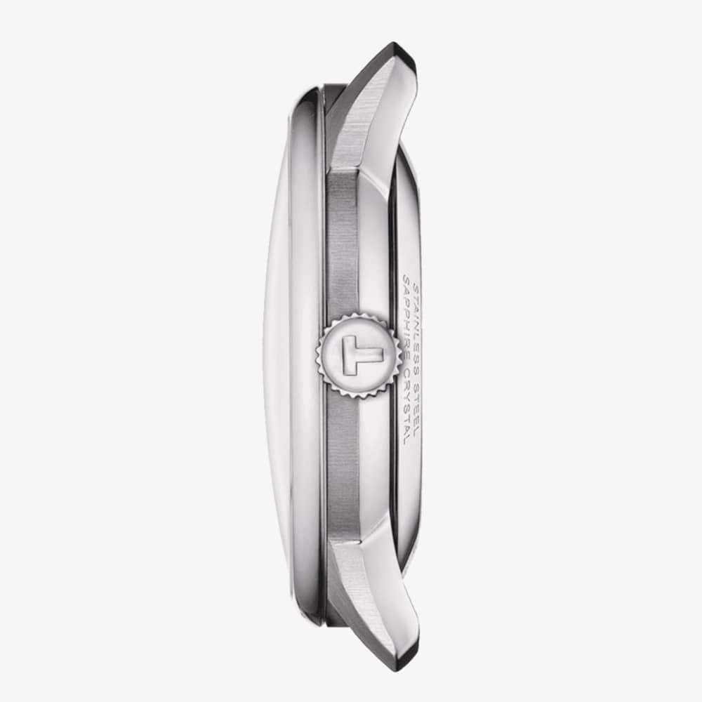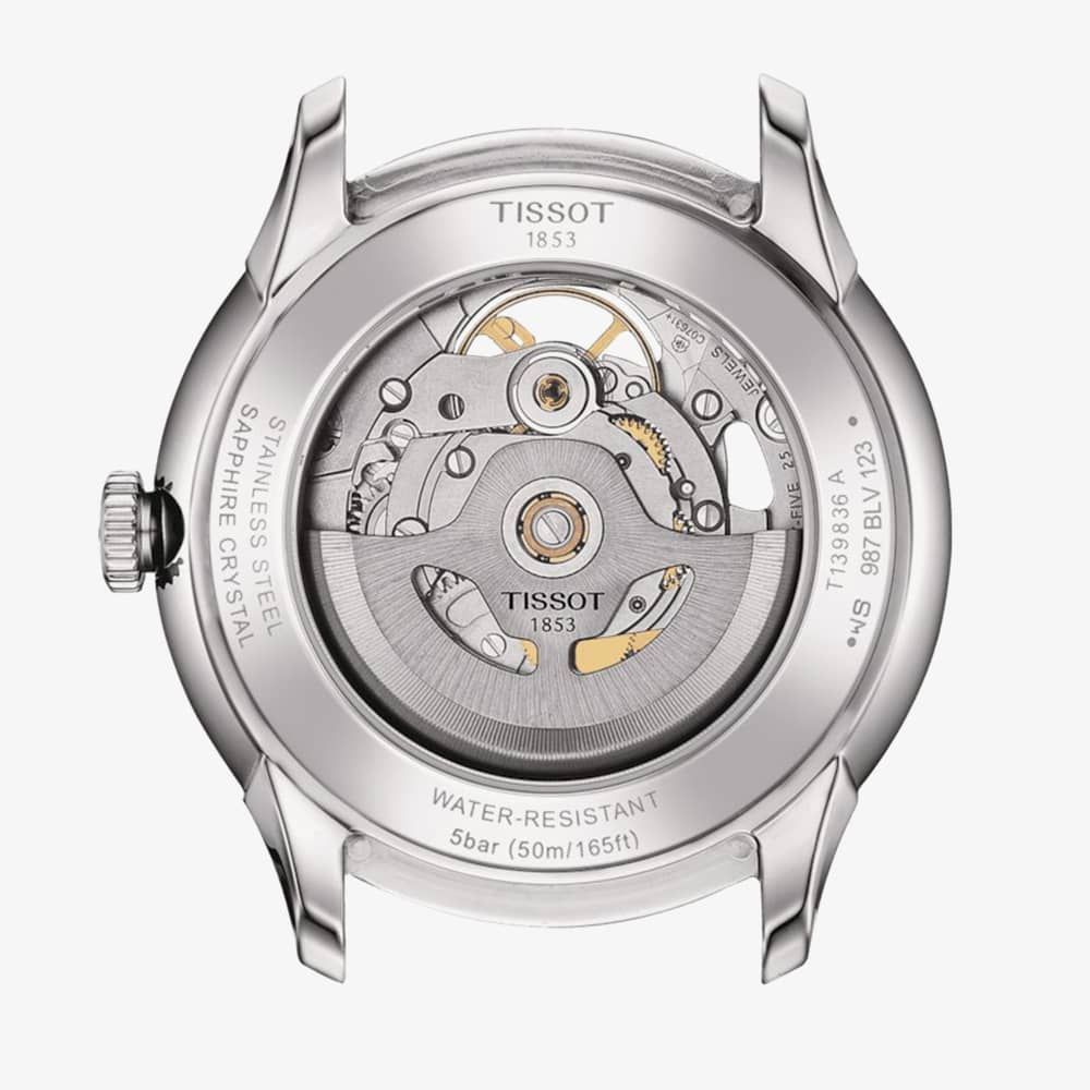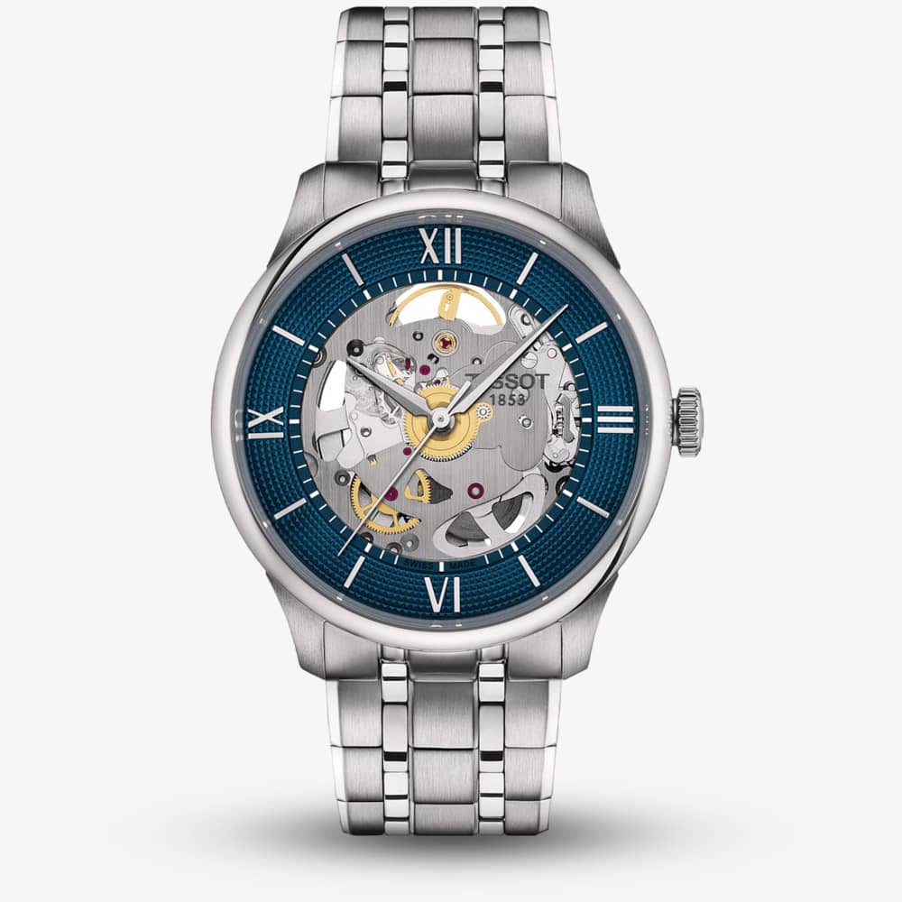 This special timepiece is named after the street in Le Locle, Switzerland, where Tissot originated in 1907. Combining contemporary design with the high-quality Powermatic 80 movement, it exudes classic elegance. This watch has blue accents and a skeleton dial, revealing this luxurious watch's intricate mechanisms.