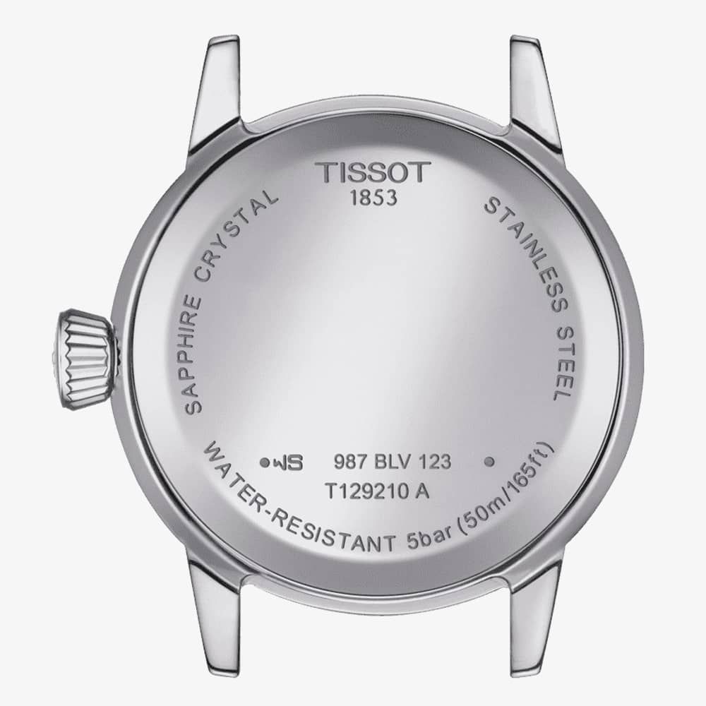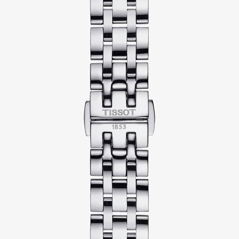The Tissot Classic Dream Lady Silver Watch T129.210.11.031.00 combines a 28mm round-shaped stainless steel case and a silver stainless-steel bracelet with a push button deployment clasp. It has a silver sunray analogue dial with the date display visible at position three, protected beneath scratch-resistant sapphire crystal glass. Power is generated by the Swiss quartz movement with an end-of-life indicator. This model also has a water resistance of up to 50 metres.